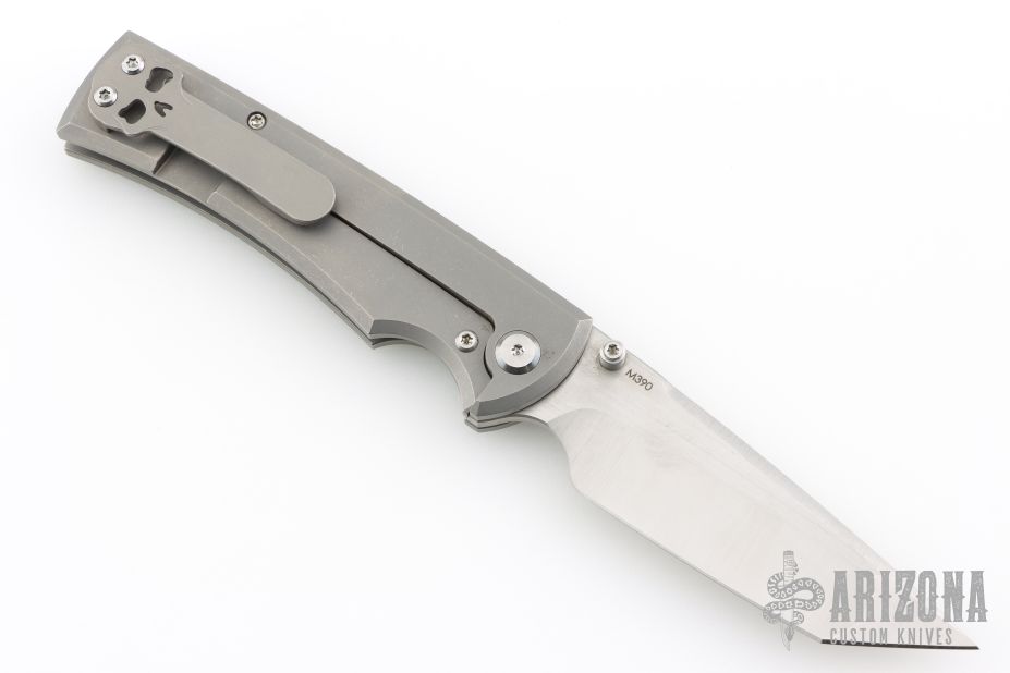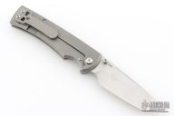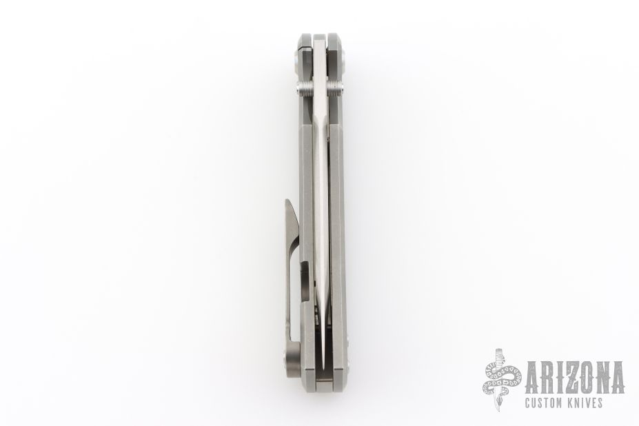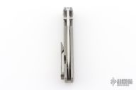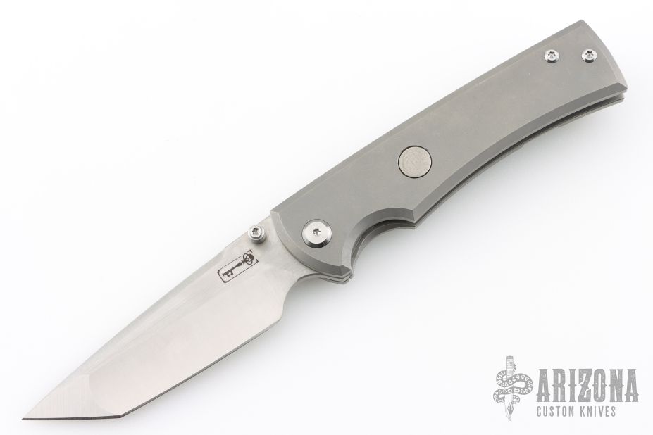 This Chaves Ultramar Liberation has been professionally converted to a side-opening automatic by Kyle Vallotton. It features a satin finished blade with the Chaves logo, a tumbled titanium frame with skull pocket clip positioned for tip-up carry, and a matching titanium backspacer. Additional details include jeweled steel backspring. The knife comes with its original box and a spare titanium pocket clip, and is offered new from the maker!