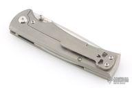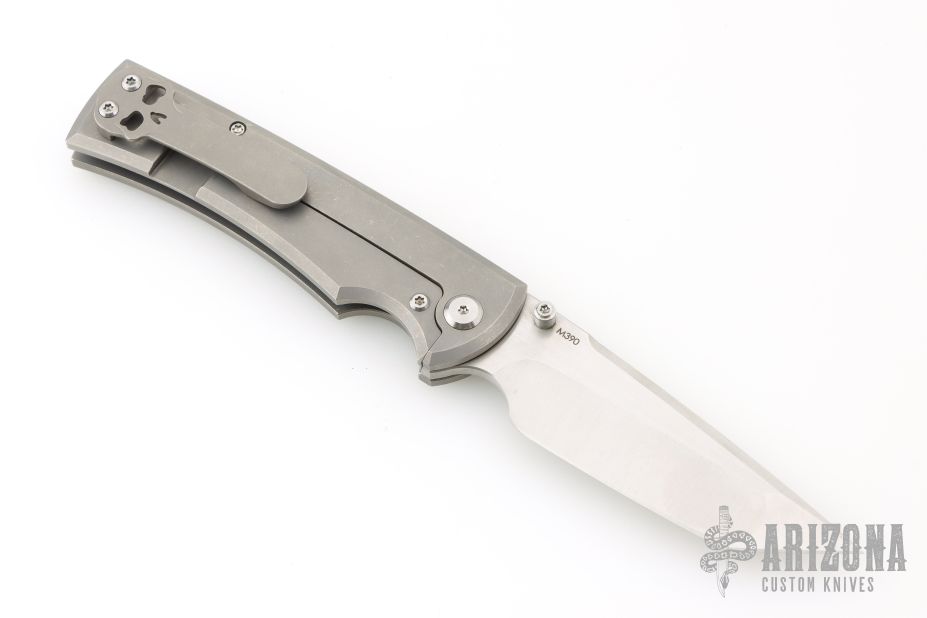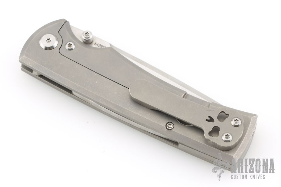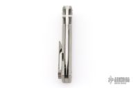 This Chaves Ultramar Liberation has been professionally converted to a side-opening automatic by Kyle Vallotton. It features a satin finished blade with the Chaves logo, a tumbled titanium frame with skull pocket clip positioned for tip-up carry, and a matching titanium backspacer. Additional details include jeweled steel backspring. The knife comes with its original box and a spare titanium pocket clip, and is offered new from the maker!