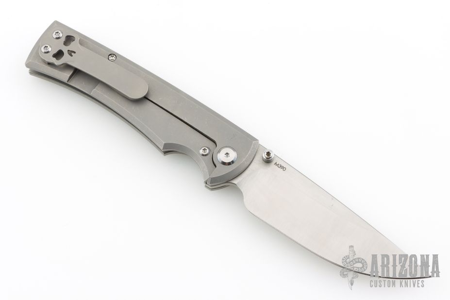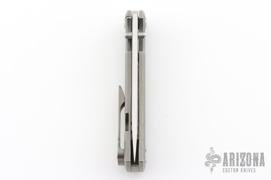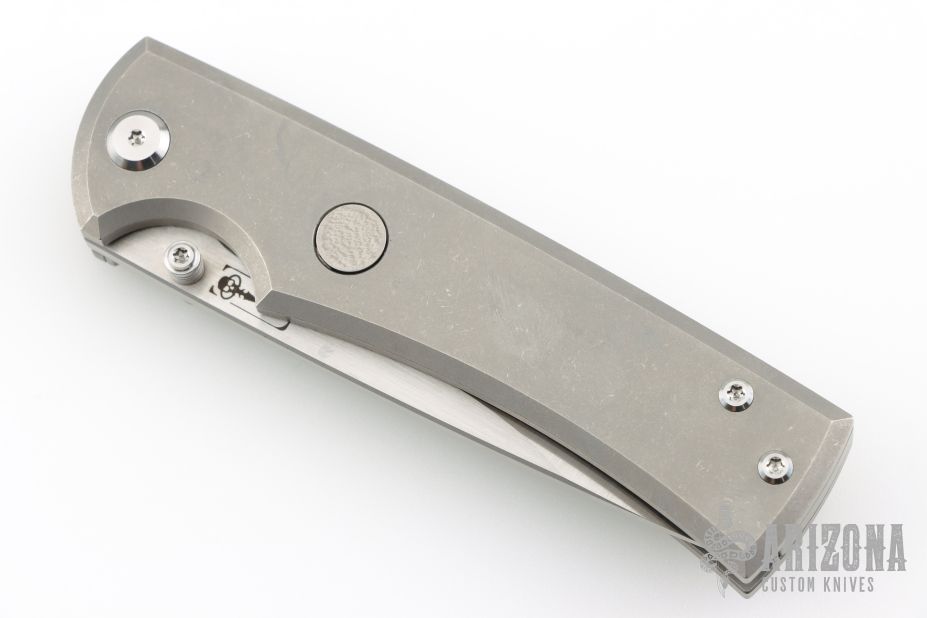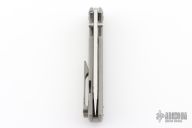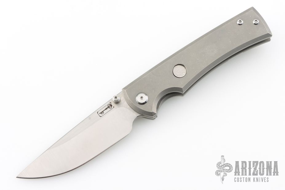 This Chaves Ultramar Liberation drop point has been professionally converted to a side-opening automatic by Kyle Vallotton. It features a satin finished blade with the Chaves logo, a tumbled titanium frame with skull pocket clip positioned for tip-up carry. Additional details include jeweled steel backspring. The knife comes with its original box and a spare titanium pocket clip, and is offered new from the maker.