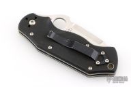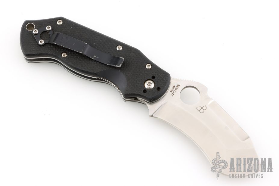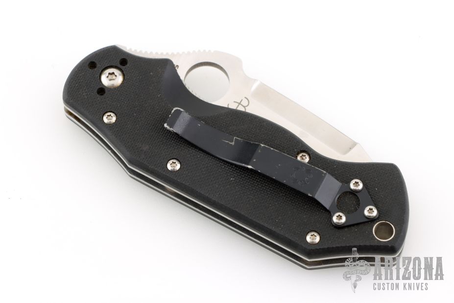 This Spyderco Captain linerlock folder has a satin finished plain edge and G10 scales, stainless steel liners, black stainless steel 4-way reversible pocket clip. Comes with original box. Has some light scuffs and scratches on the clip and body. Great condition otherwise.
