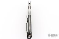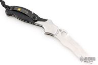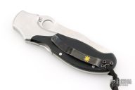 This C104BMP from Spyderco features a satin finish Kris style blade with thumb hole. The handle is comprised of stainless steel bolsters and black G10 scales over steel liners, backspacer and lock bar. Black coated steel clip positioned for tip up carry. Lanyard tube in pommel. This model is discontinued. Includes original box. Has scuffs and scratches throughout. Good condition otherwise.