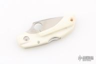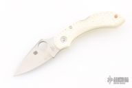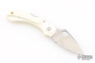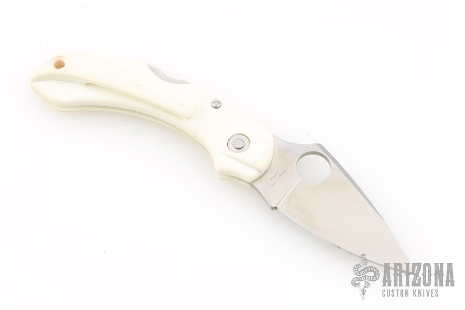 This Dragonfly by Spyderco features a satin finished blade with thumbhole and notched thumbrest. The handle has white scales and a tip up clip. Comes with original box. Has some scuffs and some discoloration on the handle. Great condition otherwise.