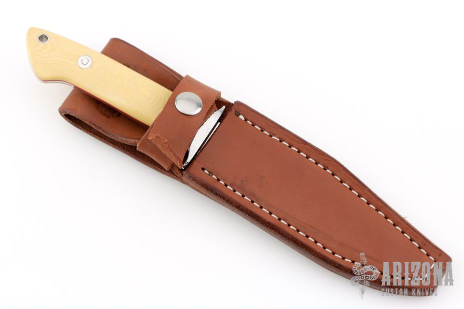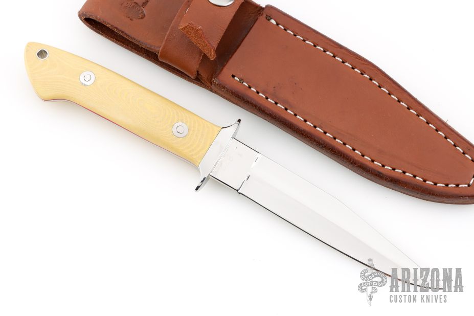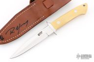 This Lawndale Boot knife by Robert Young features a mirror polished blade with false top edge, .151" blade stock and .946" blade depth, tapered tang construction. The handle has 416 stainless steel guard, ivory paper micarta with red liners, 416 steel hardware and lanyard hole in pommel. Comes with a leather sheath, and maker's card. New from maker!