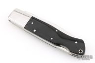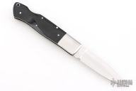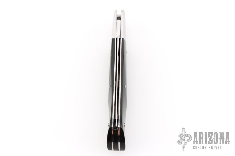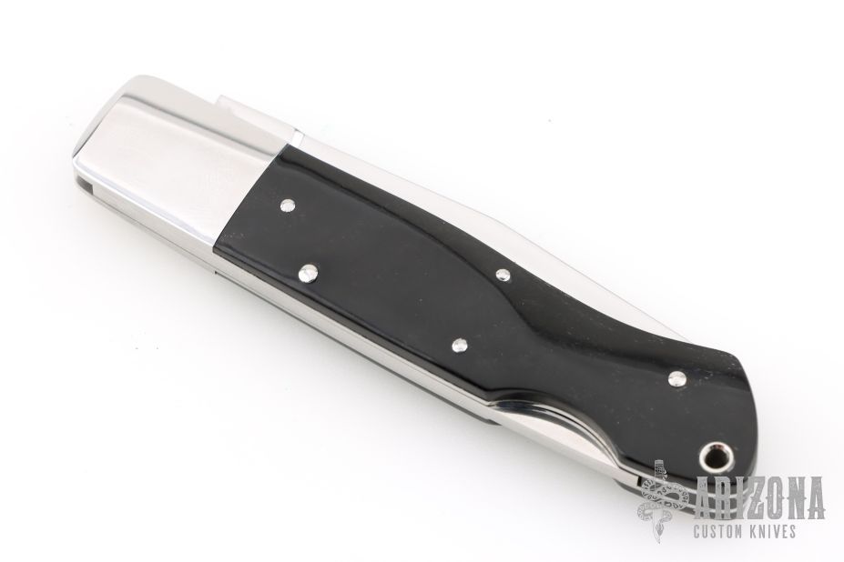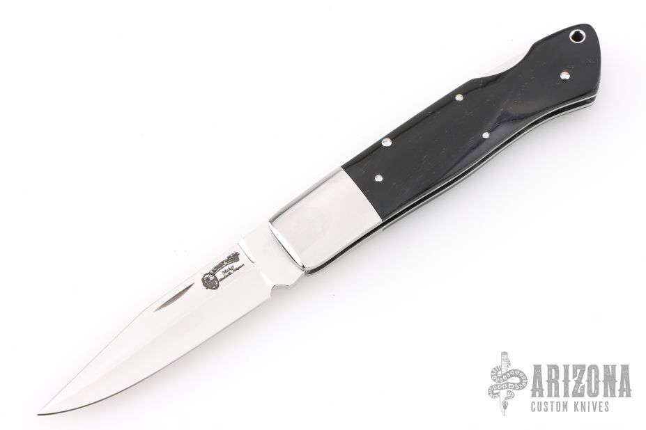 This lockback by Robert Young features a mirror finished clip point blade with false top edge and nail nick. The handle is comprised of 416 stainless steel bolsters with integral liners, black rams horn, domed pins, and stainless rockerbar. Comes with zippered case and maker's card. New from maker!