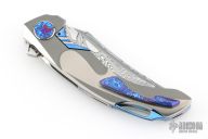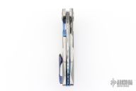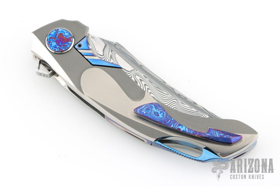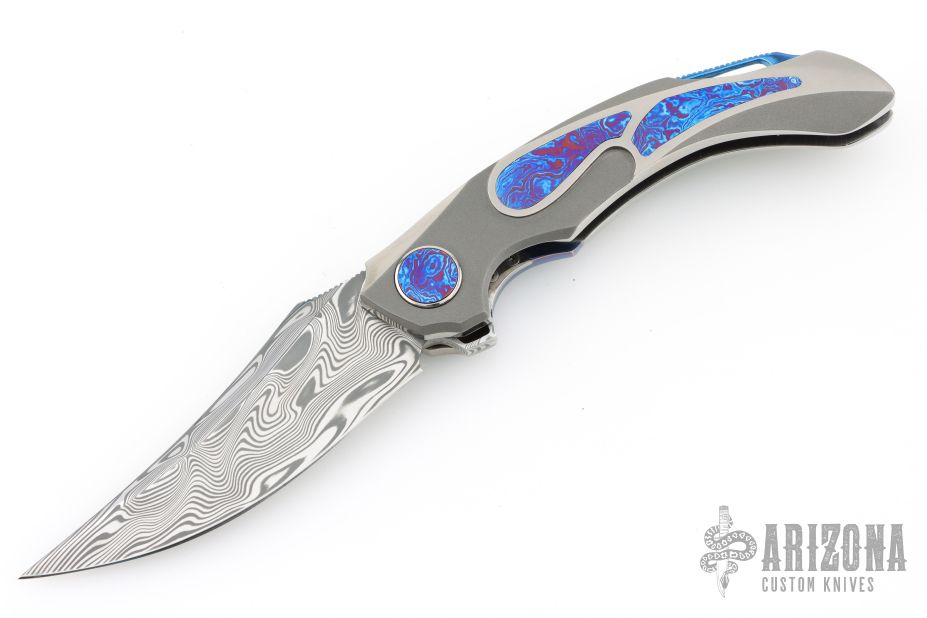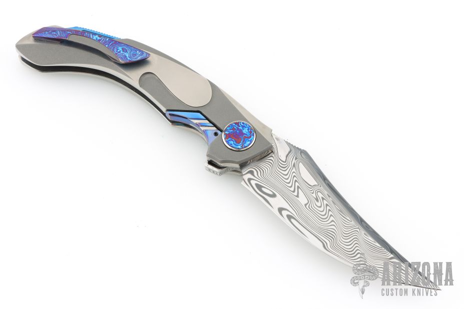 This Phoenix framelock flipper by Ron Best is amazing. It features a Damasteel blade with notched thumbrest and flipper. The handle has a two-tone titanium frame with timascus inlays, timascus inlaid pivot, timascus tip up clip, anodized titanium backspacer, and an anodized titanium lockbar with stainless steel lockface insert. Inside of backspacer reads "Phoenix Flipper #2 Ronald Best 11/21/20" Nice detent, lockup and blade seating. Comes with original box. Excellent condition.