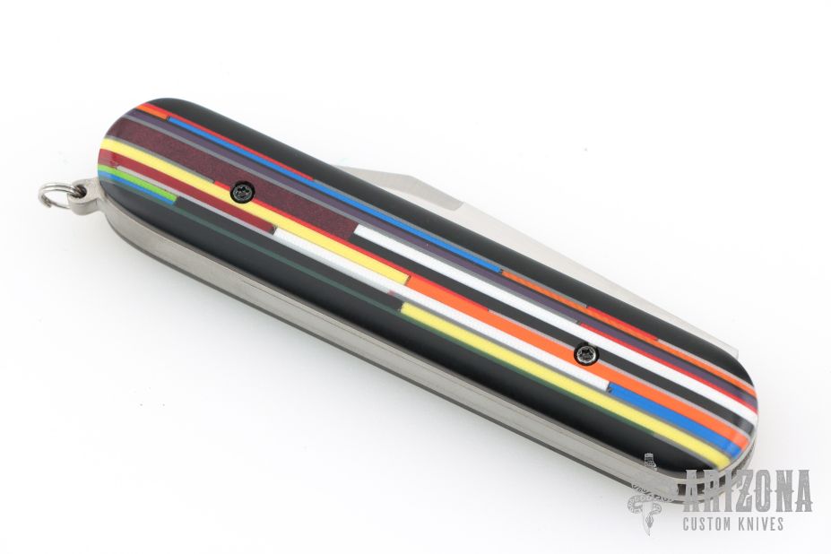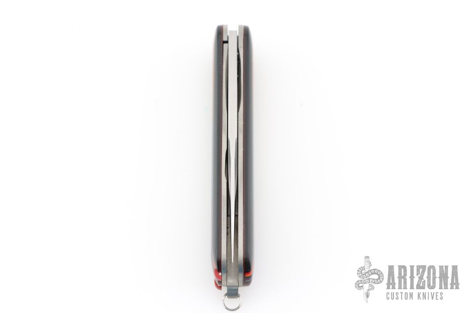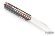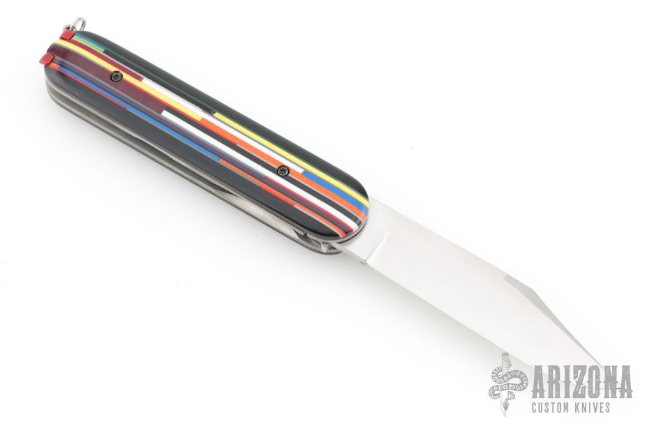This Switch Army Switchblade by Chuck Gedraitis features a satin finished blade with false top edge. The handle has Mosaic G-10 and Richlite scales, orange peel finished titanium liners, orange peel finished stainless steel backspacer with lanyard hole. Has tweezers and toothpick like a Swiss Army Knife. Nice action, lockup and blade seating. Comes with a zippered case and COA dated 2025. New from maker at the 2025 CCKS.
