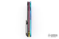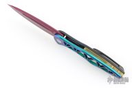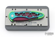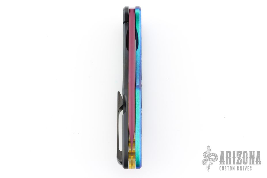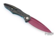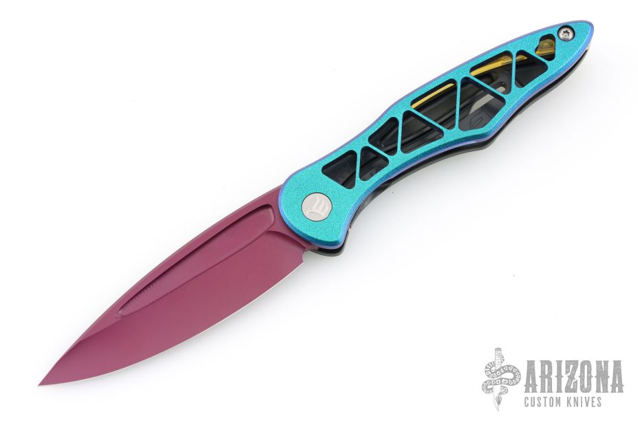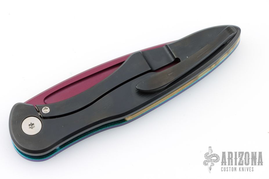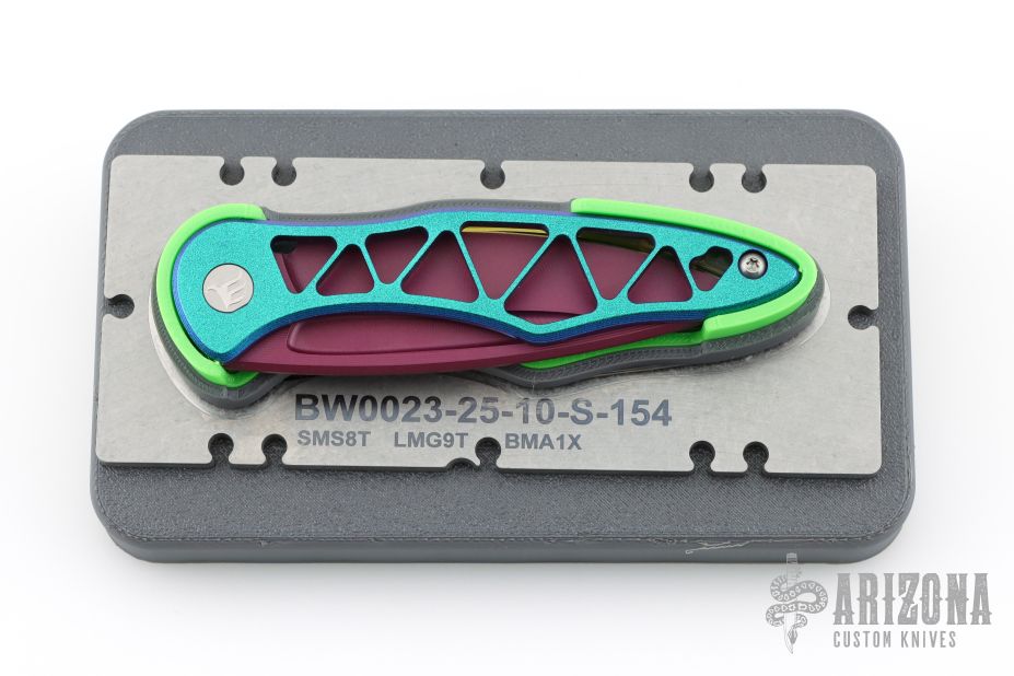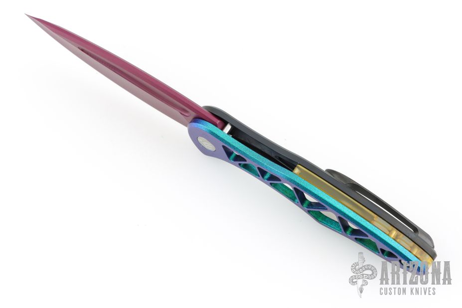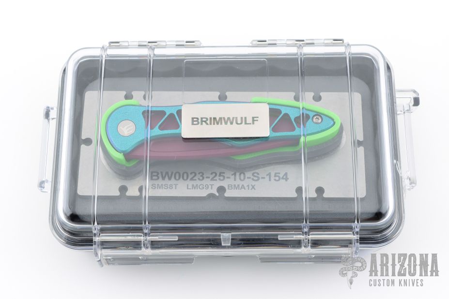 This Brimwulf by Everburn Knives features a maroon cerakote blade with hollow ground milled bevels, milled fullers. CPM 154 @ 61 HRC. The handle has a pearl blue/purple anodized skeletonized showside, black anodized titanium lockside and tip up clip with hidden screws, ultem backspacer. Rides on bearings, nice detent, lockup and blade seating. Has a replaceable stainless lockface insert with ceramic detent ball set to .0260" high. Comes with original box with 3D printed holder in the case. Comes with a very in-depth COA dated 10-25-25. New from maker at the 2025 CCKS.