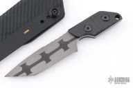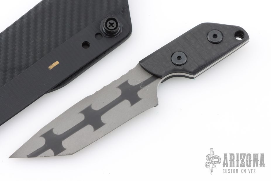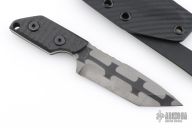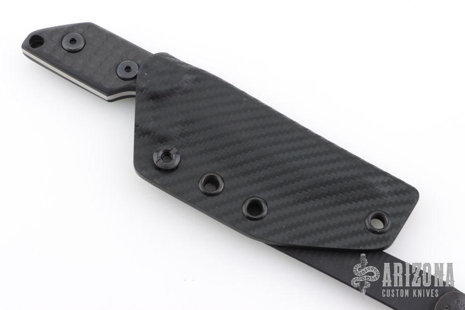 This is a Duane Dwyer custom knife with a razor wire coated chisel ground tanto blade with a notched thumbrest, .122" blade thickness and 1.065" blade depth, full tang construction. The handle has milled carbon fiber scales. Nice feel in the hand. Comes with a kydex sheath. New from maker at the 2025 CCKS.