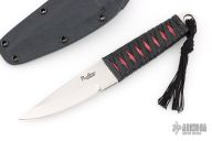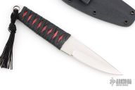 This drop point by Al Polkowski features a satin finished blade with notched thumb and finger rests, .133" blade stock and 1.030" blade depth, full tang construction. The handle has is wrapped and epoxied cord. Comes with a kydex sheath with belt clip. Has a couple extremely light scratches, otherwise excellent condition. Comes with a zippered case.