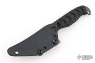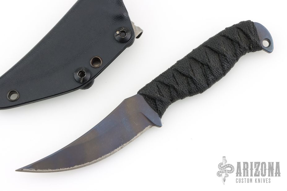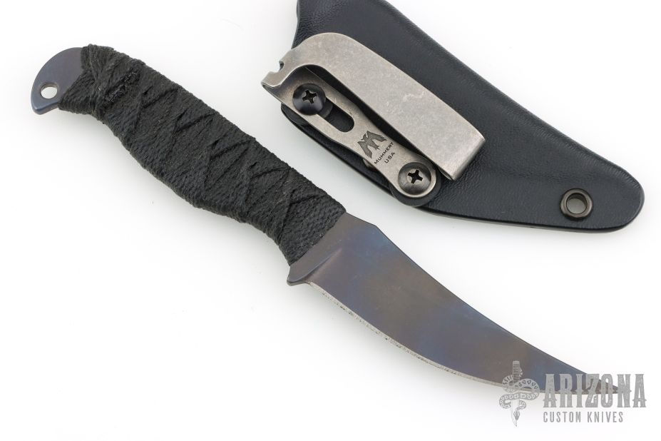 This knife by Joe Watson features an anodized and tumbled titanium blade with carbidized edge, .160" blade stock and .996" blade depth, hidden tang construction. The handle has black cord wrap over black cord under wrap. Comes with a kydex sheath and a zippered case. Excellent condition.