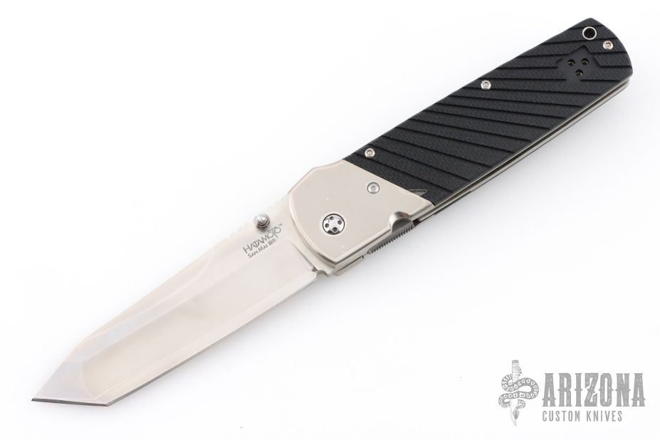 This Hatamoto linerlock by Cold Steel has a high satin finished San Mai III stainless steel tanto blade with dual thumb studs and notched thumb rest. Handle is black G10 over titanium liners and satin finished titanium bolsters. Stainless steel tip up reversible clip and lanyard hole. New condition. Comes with original box and aluminum case. Still has the protective covers on the bolsters.