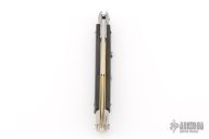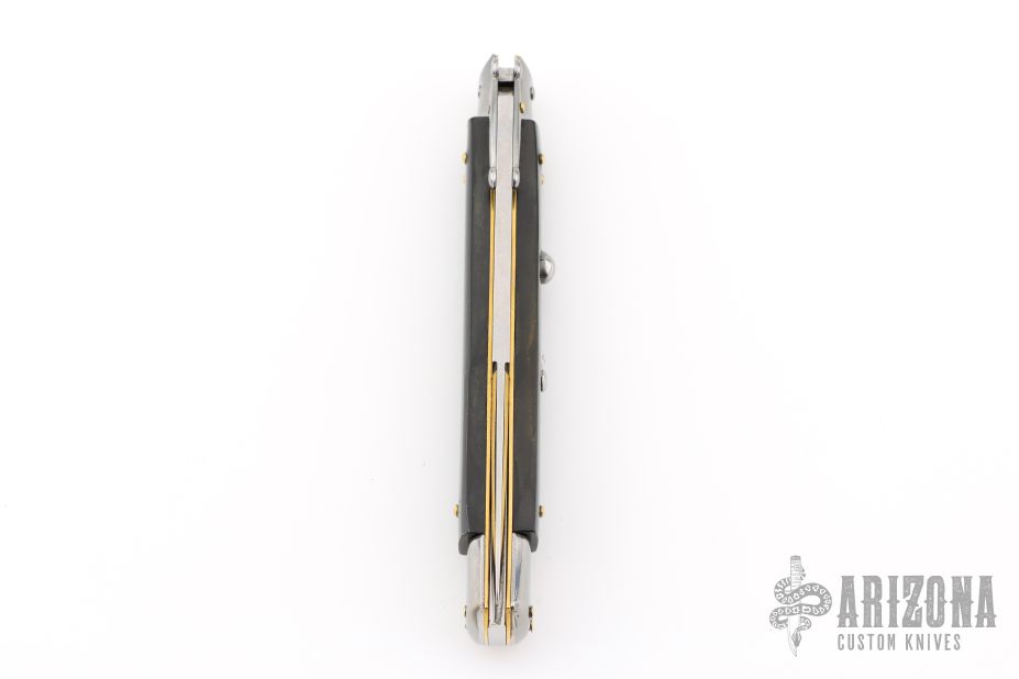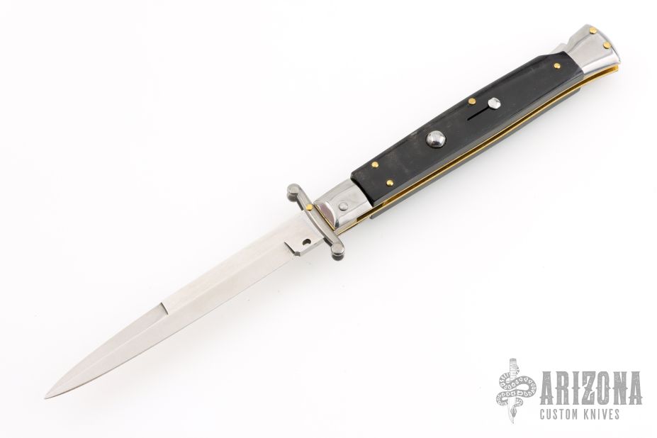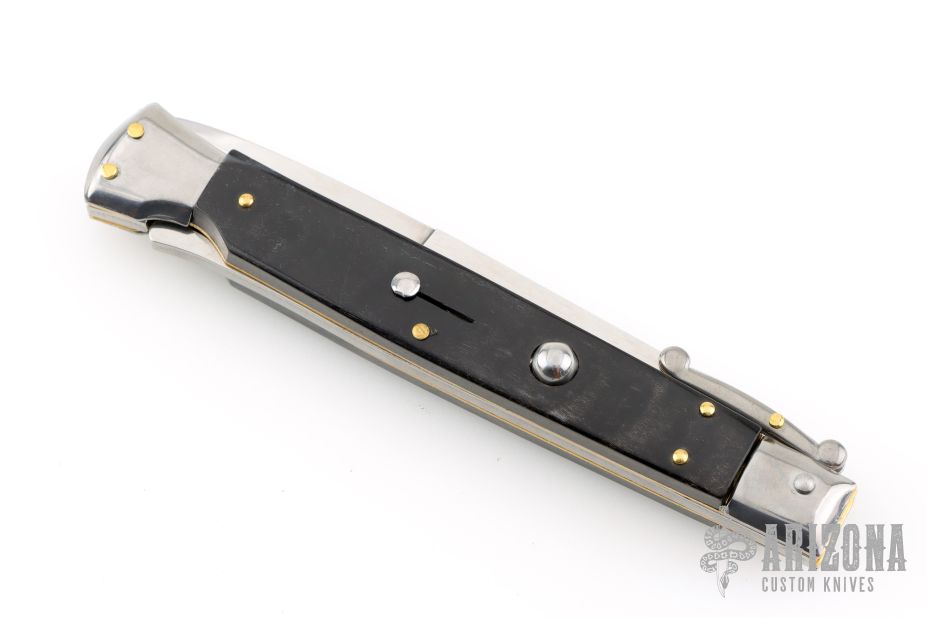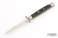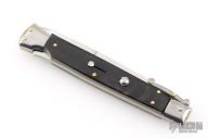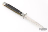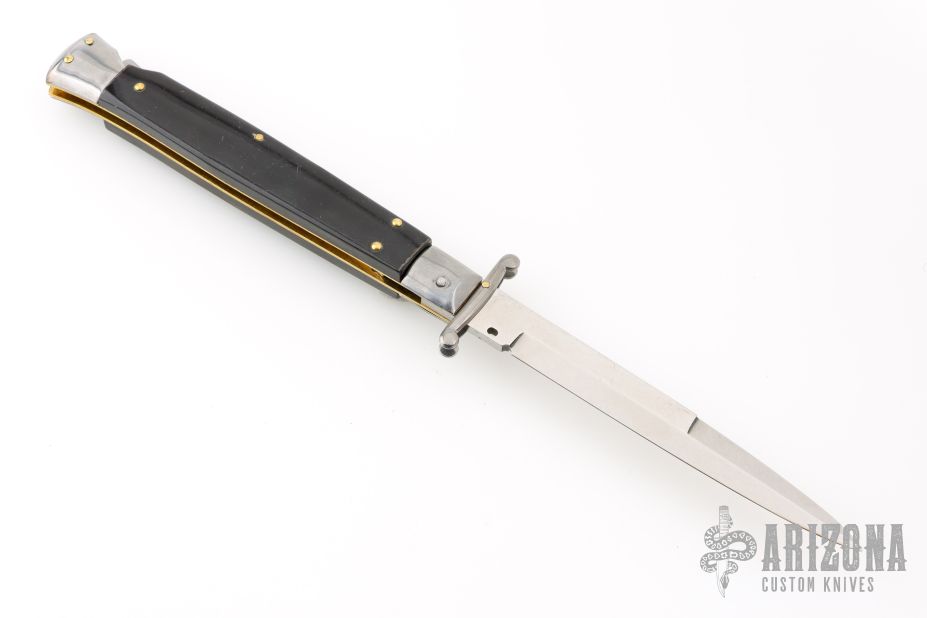 This 11" Swing Guard Auto by Frank Beltrame features a bayonet ground blade with false top edge. The handle has stainless steel bolsters, front and rear, imitation horn scales, brass liners, stainless spring. Excellent condition.