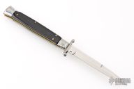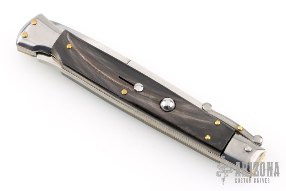 This 11" Swing Guard Auto by Frank Beltrame features a dagger ground blade with false top edge. The handle has stainless steel bolsters, front and rear, buffalo horn scales, brass liners, stainless spring. Excellent condition.