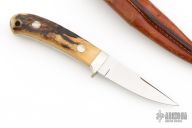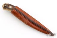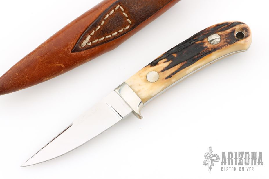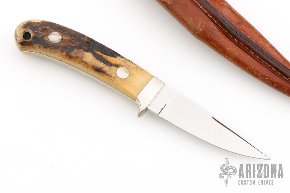 This knife by the Late Masao Takahashi features a mirror polished blade with false top edge, .162" blade thickness and .763" blade depth, full tapered tang construction. The handle has a nickel silver guard with stag scales, nickel silver pins and a lanyard hole. Comes with a brown leather dangler sheath. Has a few light scratches, otherwise excellent condition.