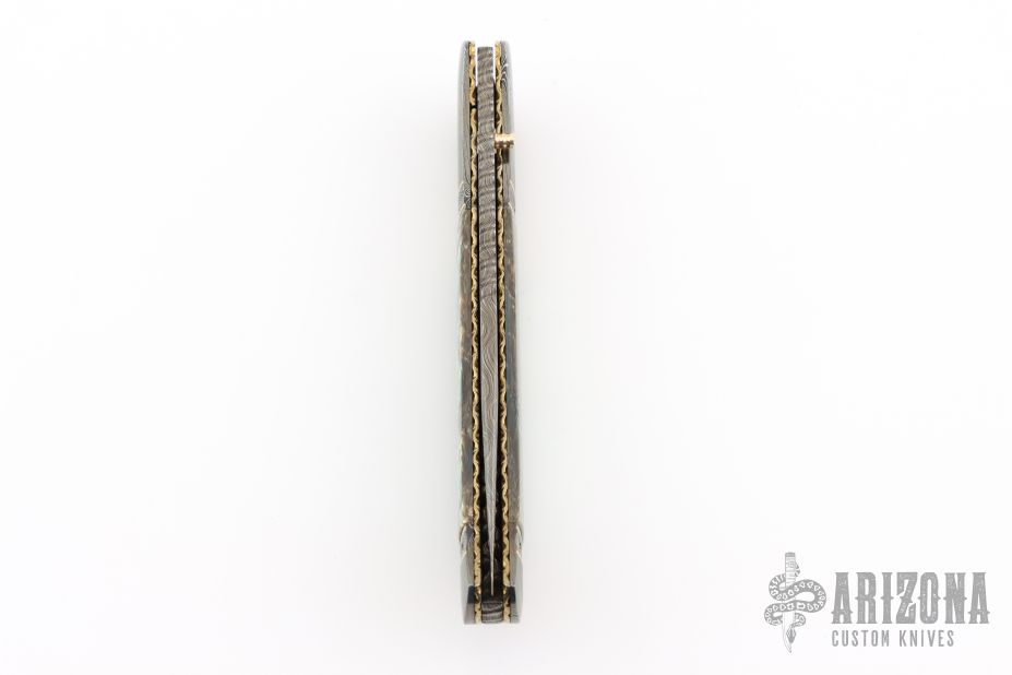 "I have been a fulltime maker since 1993 and am proud to be a voting member of the Knifemakers Guild. Most of my work is in embellished locking folders, with an occasional art fixed blade. In 1994 I began doing my own engraving and started making Damascus in 1999. I prefer natural handle materials such as mother of pearl, fossil Ivories and stone. Blade steel is my Damascus (unless otherwise noted) or one of the high quality stainless steels currently available. The embellishments I offer are engraving, gold inlay, mosaic pearl inlays, file work, carving and solid 14K gold screws and thumb studs that I make in shop."