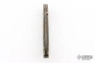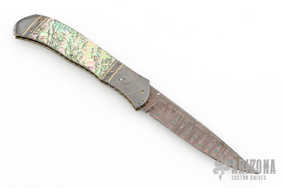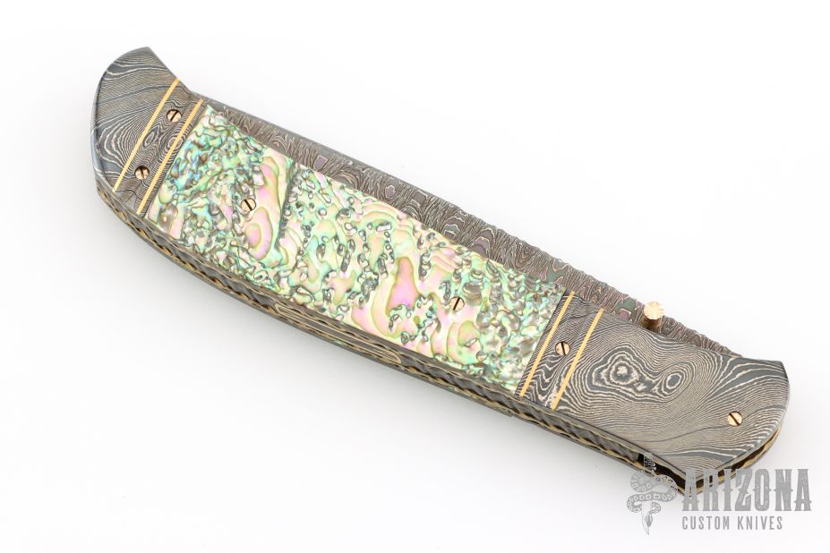 This Gentleman's Linerlock by John W. Smith features a Damascus blade with fileworked spine and single gold thumb stud. The handle has fluted Damascus bolsters with gold inlaid engraving, abalone scales with fileworked gold plated screws, anodized and fileworked titanium liners, fileworked Damascus backspacer with gold inlaid engraving. Nice lockup and blade seating. Includes a zippered leather case. Excellent condition.