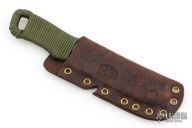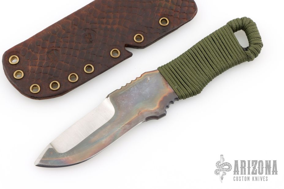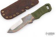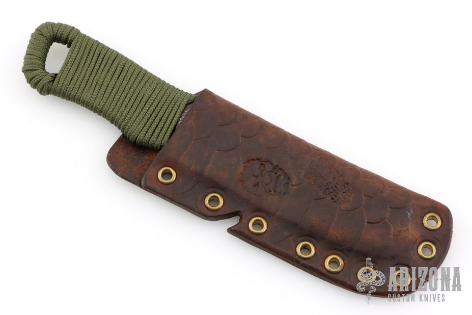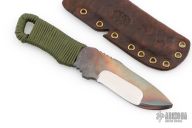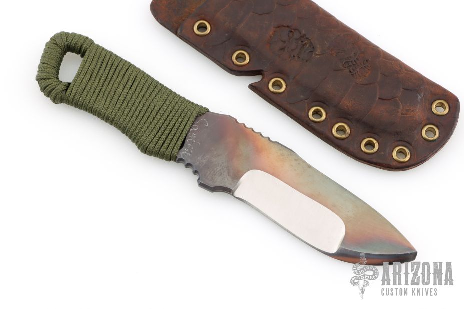 This Saoirse fixed blade by Frank Landau features a chisel ground blade with temper color finish, notched thumb and finger rests, .157" blade stock and 1.119" blade depth, full tang construction with cord wrapped grip. Comes with a tooled leather sheath. Excellent condition.
