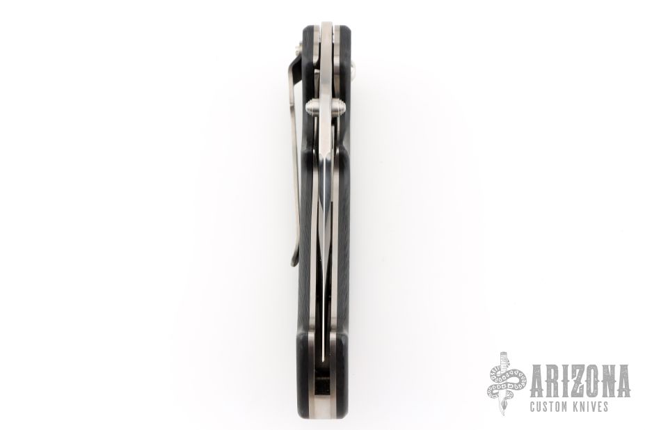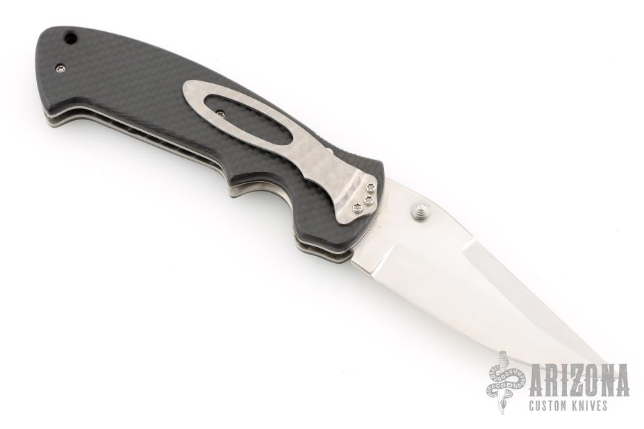 This Kasper by Crawford Knives features a satin/polish finished blade with swedge and dual thumbstuds. The handle has carbon fiber scales, titanium liners, tip down jeweled titanium clip and satin finished steel backspacer. Nice detent, blade seating and lockup. Has a couple light scratches, otherwise excellent condition.