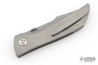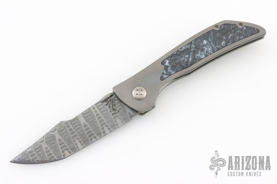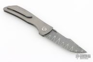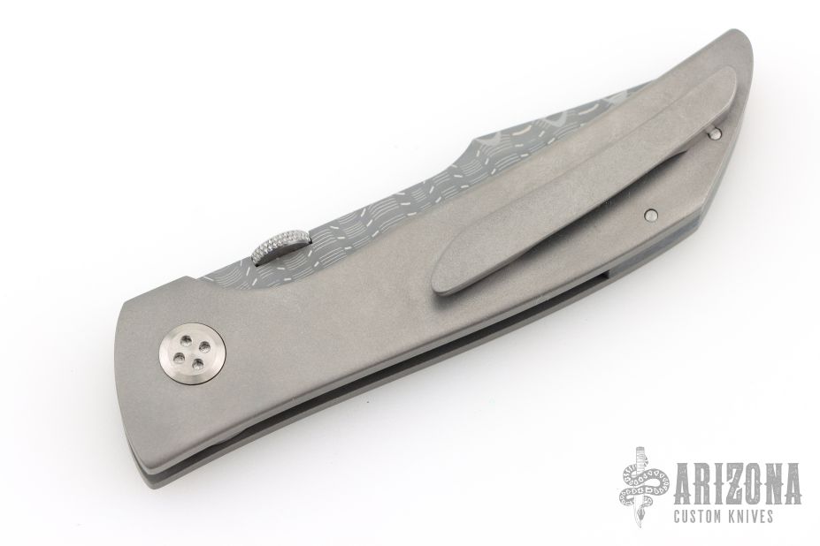 This Son of Shuck linerlock from John Barker features a Damascus tanto blade with swedge and a thumbdisc. The handle has a bead blasted titanium frame with a black/blue/white Westy Glass inlay, stainless steel inlaid liner, black/blue/white Westy Glass backspacer, with a bead blasted titanium tip up pocket clip. Nice detent, lockup and blade seating. Includes a zippered case. New from maker at the 2025 FNBA.