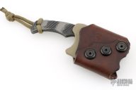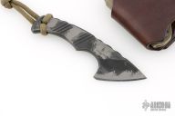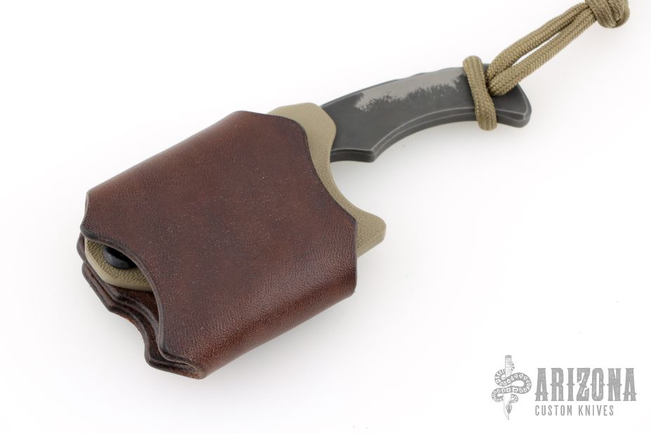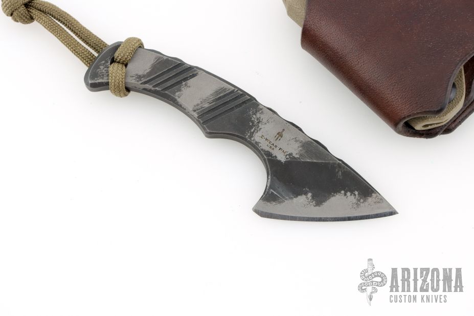 This custom kiridashi by Miller Bros Blades features a black/gray distressed finished drop point blade .251" blade stock 1.189" blade depth, full tang construction. The handle has a matching finish with notches on the spine, and pin stripe threading on the flats with lanyard hole in pommel. Comes with a Kydex/leather sheath with clip. Has some light scuffs, otherwise Excellent condition.