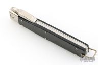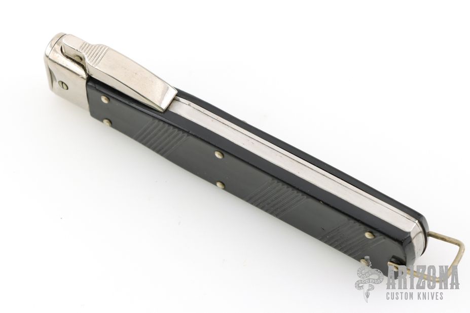 This Gravity Knife by WKC features a drop point blade. The handle has nickel silver fittings and black scales, lanyard bail. Old and a little rough, but still functions. Has scratches and dings. Has been resharpened. Good condition.