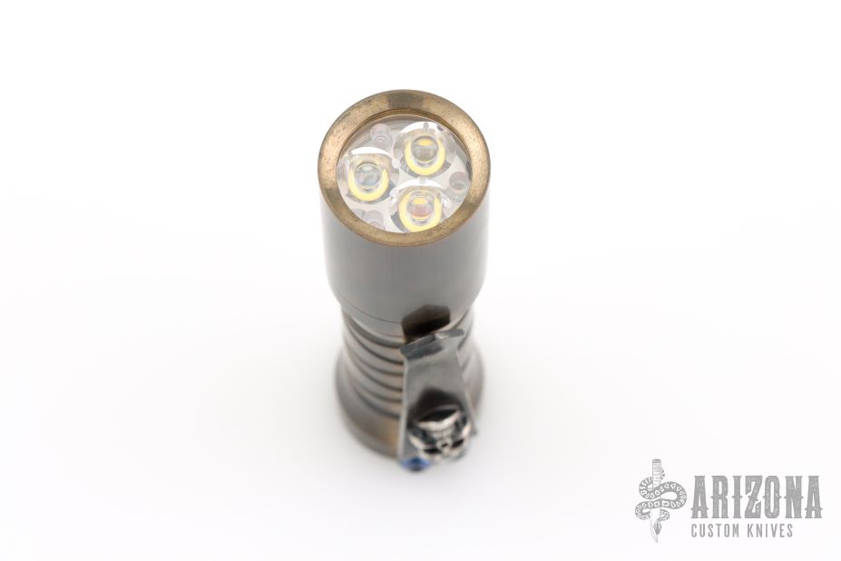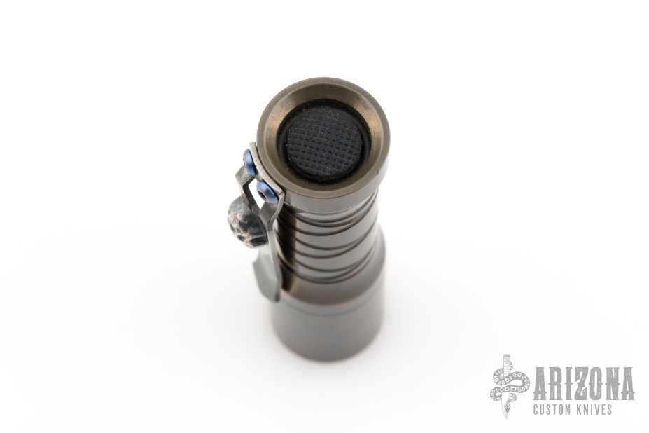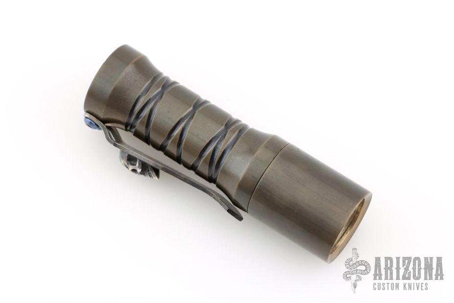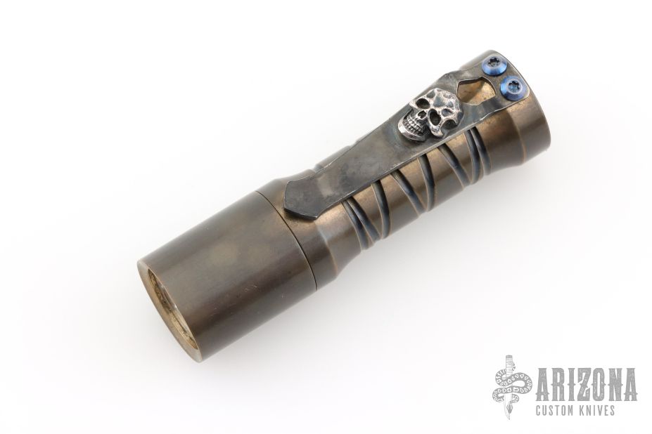 Deadwoods Custom Works Huckleberry Flashlight Copper body with spiral milling. Comes with a Steel Flame Skull clip. Has some light scuffs, otherwise excellent condition.