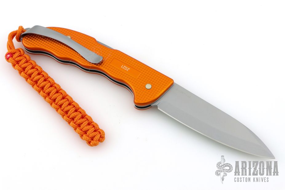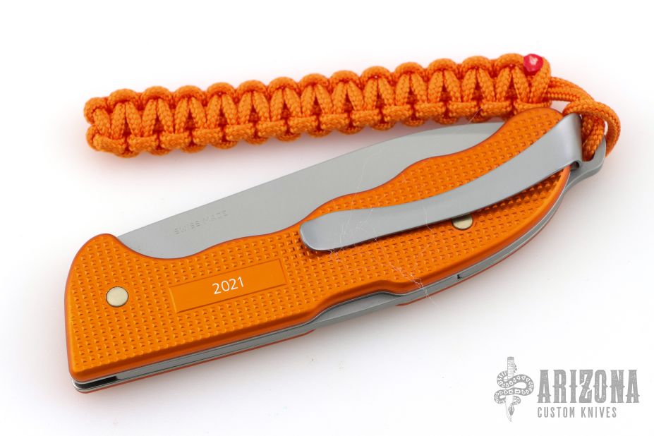 This Victorinox Pro Hunter Alox Limited Edition lockback features a bead blast finished drop point blade with notched thumb rest. The handle has stainless liners, rockerbar, textured covers, and extended pommel lanyard bail. Has a tip up clip. Comes with original box, lanyard, and papers. Dated 2021 on the frame. Excellent condition.