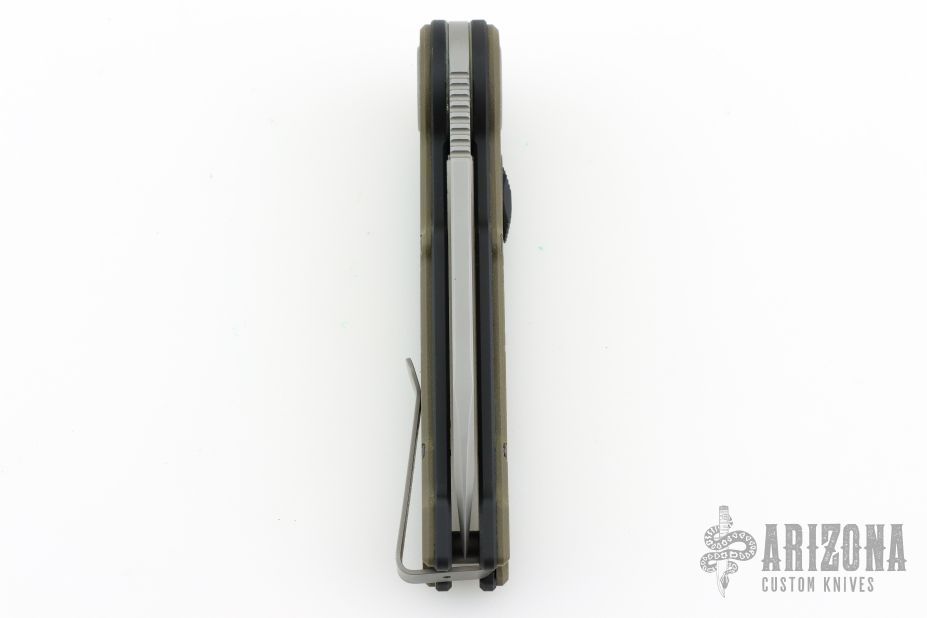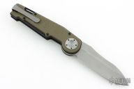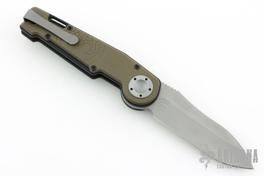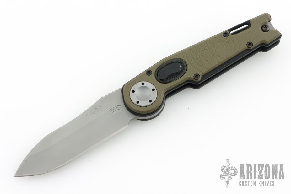 This MUDD Auto folder from Grant and Gavin Hawk features a bead blast finished spear point blade with notched thumb ramp. The handle has textured and engraved scales, black finished titanium frame, tip up reversible tumble finished titanium clip. Nice lockup and blade seating. Comes with original pouch and card. Has a few light scuffs and scratches. Great overall condition.