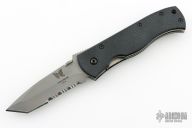 This knife is the Benchmade version of an Emerson CQC7. This knife has a chisel ground bead blast finished partially serrated blade with thumbdisc and notched thumbrest. The handle has black G-10 scales, titanium liners and a tip down black stainless steel clip.  Has a couple light scuffs and scratches, excellent condition otherwise.