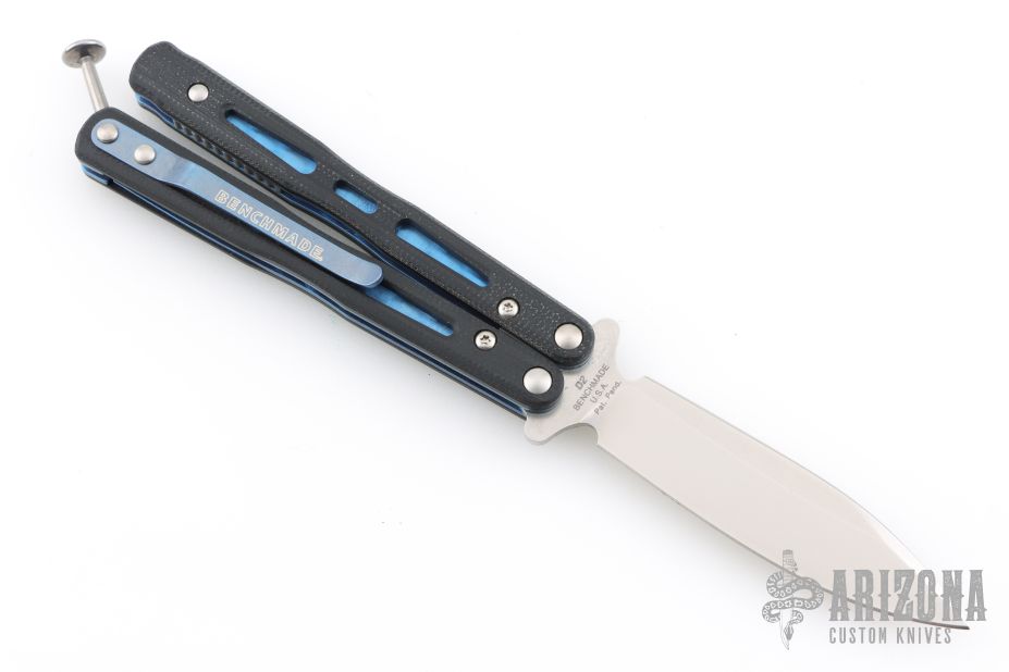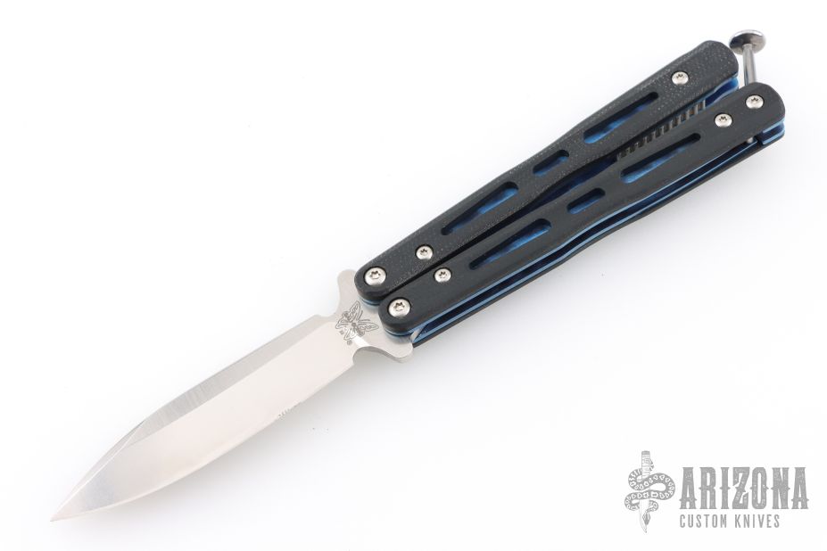 This Model 32 Morpho Balisong by Benchmade has a stonewashed spear point blade. Handle is black G-10 with blue anodized titanium liners and milled stainless steel spacers. Blue anodized titanium tip up clip. Comes with original box. Excellent condition.