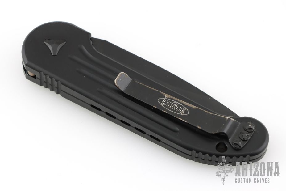 This LUDT side opening automatic by Microtech has a black blade with a standard edge and a black aluminum frame. This tactical version has black fittings. Stainless steel clip. Dated 10/2022 s/n 28135. Comes with original box and papers. Has scuffs and scratches, great condition otherwise.