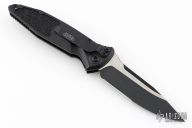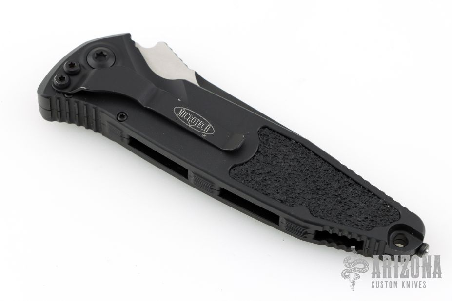 This Socom Elite Auto from Microtech has two toned drop point partially serrated blade with notched thumbrest. The handle has a black aluminum frame with non-slip rubber inserts and a tip down stainless steel clip. Dated 03/2023 and S/N 8994. Includes original box and paperwork. Has a few dings in the frame and a few light scuffs, great condition otherwise.