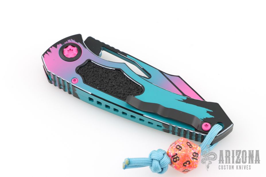 This Pariah Manual by Heretic Knives features a Miami Vice tanto blade with notched thumbrest and dual thumbstuds. The handle has a pink/blue aluminum frame with non-slip inserts, black titanium pivot collars and a tip up clip with ceramic ball. Comes with original box and has a lanyard. S/N 120, 08/25. Excellent condition.