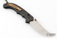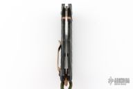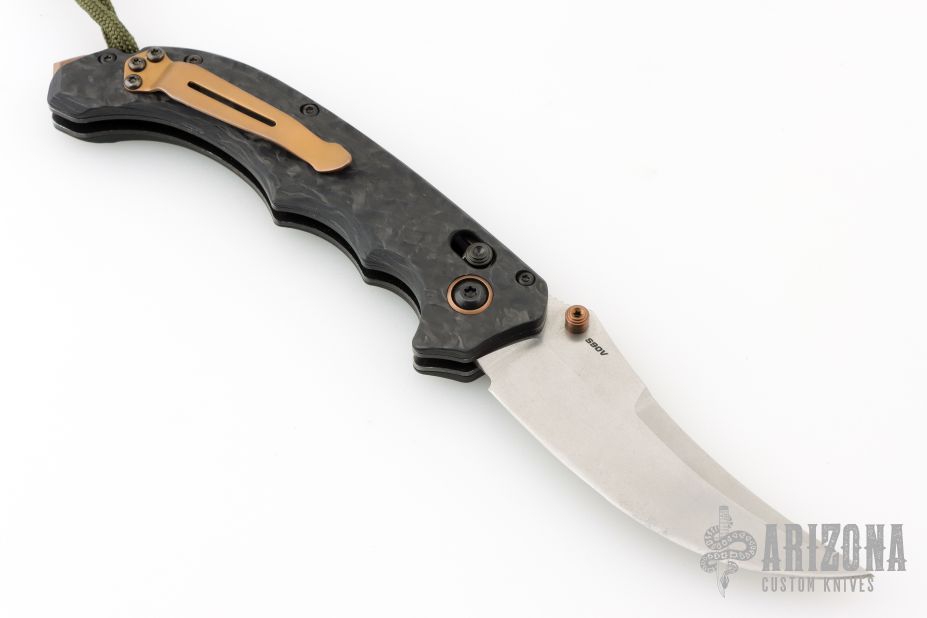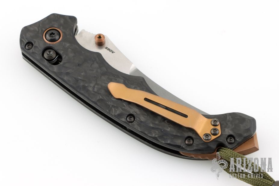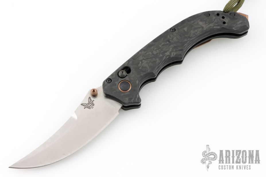 This 865SBK Mini Bedlam from Benchmade features a tumble finished trailing point blade with swedge, dual thumb studs and notched thumb rest. The handle is comprised of marble carbon fiber scales over black coated steel liners and bronze coated steel backspacer with lanyard hole and glass breaker. Bronze coated tip up pocket clip can be mounted for right or left hand carry. Comes with original box, pouch and papers. Has a few light scuffs, excellent condition otherwise.