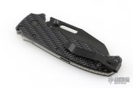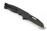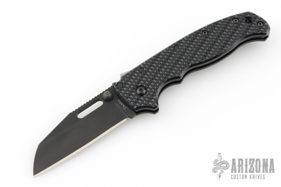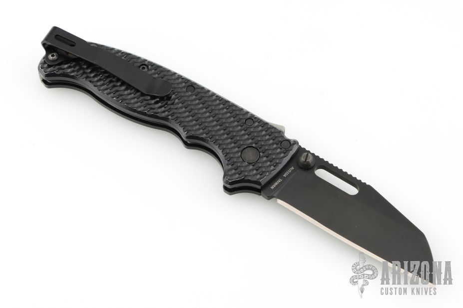 The AD20.5 by Demko Knives features the impressive Shark Lock and an even more impressive price point. The Shark Lock mechanism is situated on the spine of the knife and operated with a ramp-like ‘fin’, allowing you to flip the blade open and closed at will. It's probably the best thing about this knife and design, how quickly it can be deployed and ready for action. It acts as a blade launcher and a little wrist action is all it needs. This one has a black blade, with custom textured black titanium scales, backstrap and clip. Comes with original box, cloth, scales, clip and backstrap. Has some light scuffs and scratches, excellent condition otherwise.