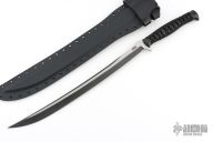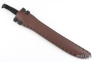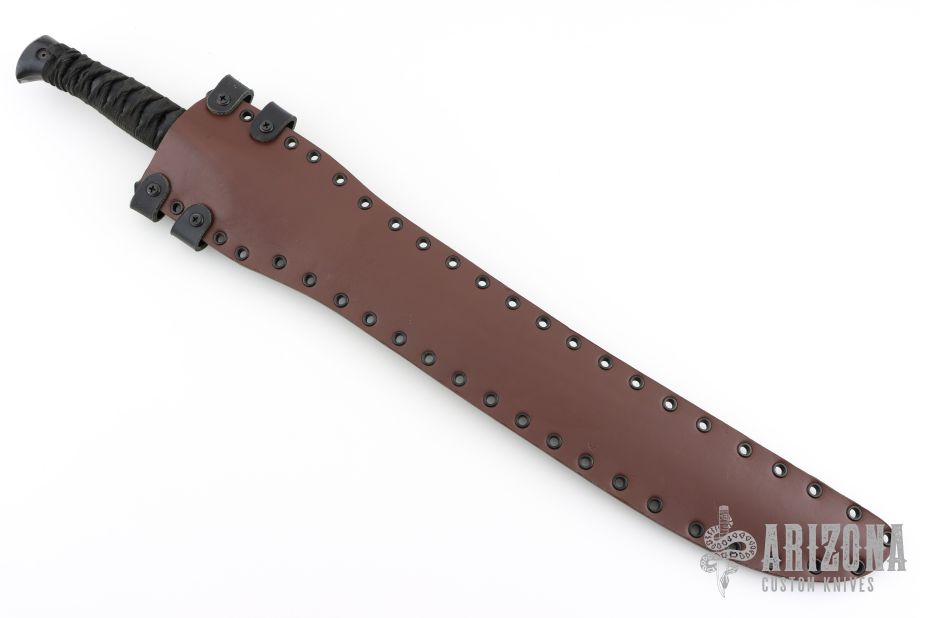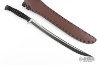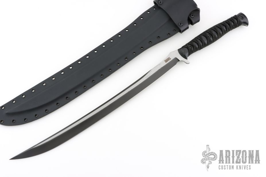 This Wakizashi by Dawson features an upswept two-tone blade with false top edge and notched thumbrest, .214" blade stock and 1.299" blade depth, full tang construction. The handle is comprised of black paracord Japanese style wrap over marble carbon fiber scales. Includes leather and Kydex sheath. Excellent condition.