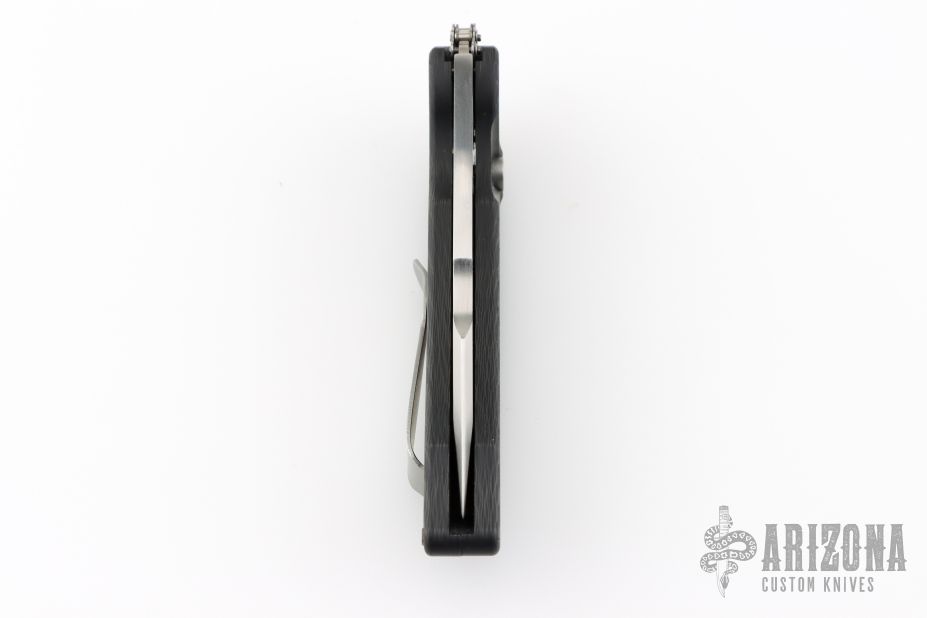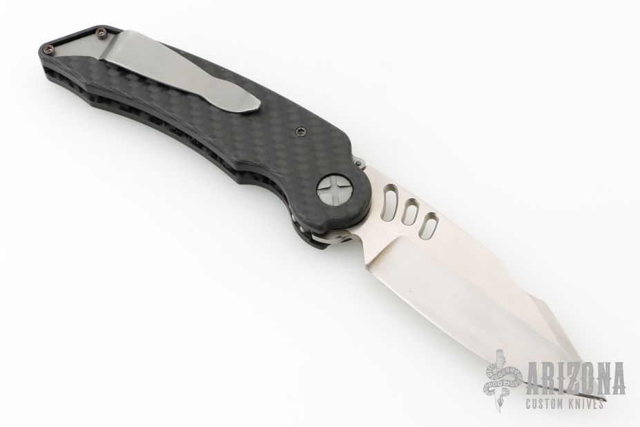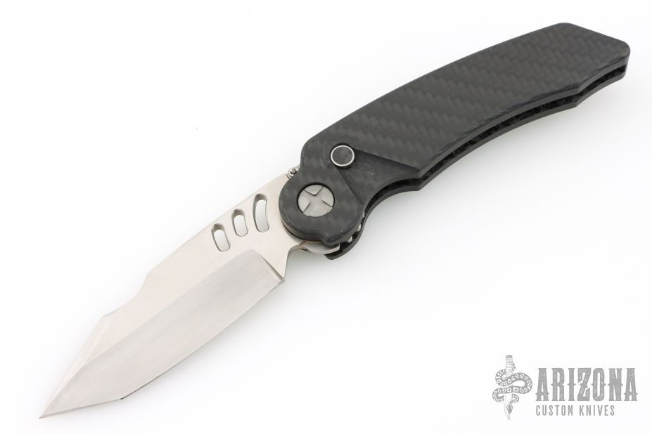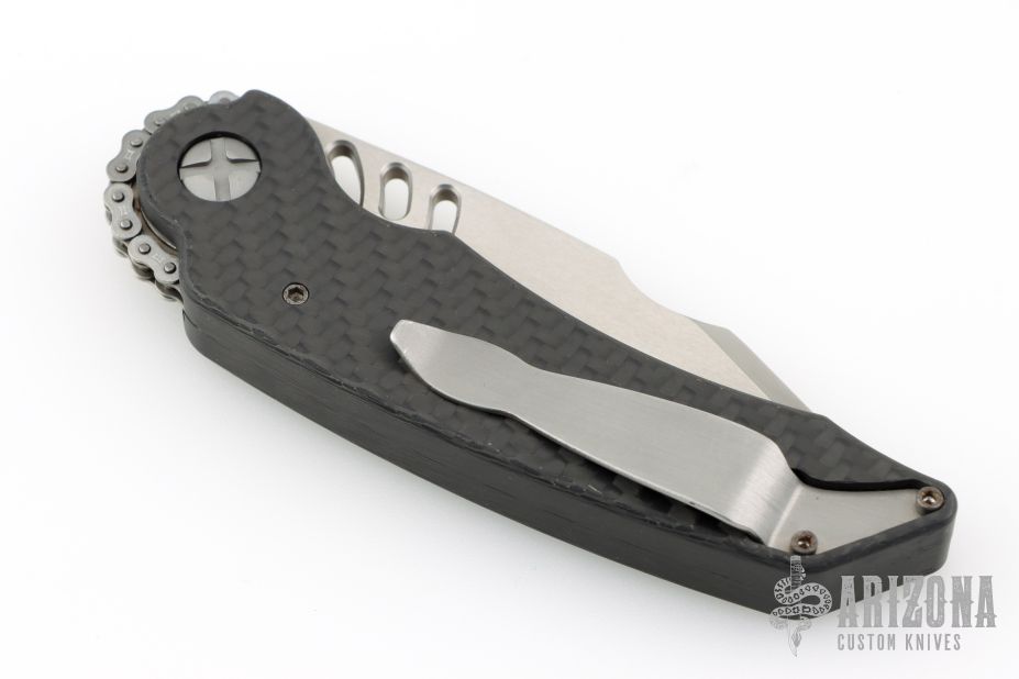 This MRX by Guardian Tactical features a clip point tanto hand rub satin finish blade. The handle is carbon fiber with a chain drive opening mechanism. Tip up stainless clip and carbon fiber inlaid button. Comes with a zipper case. Has a couple light scuffs, excellent condition otherwise.