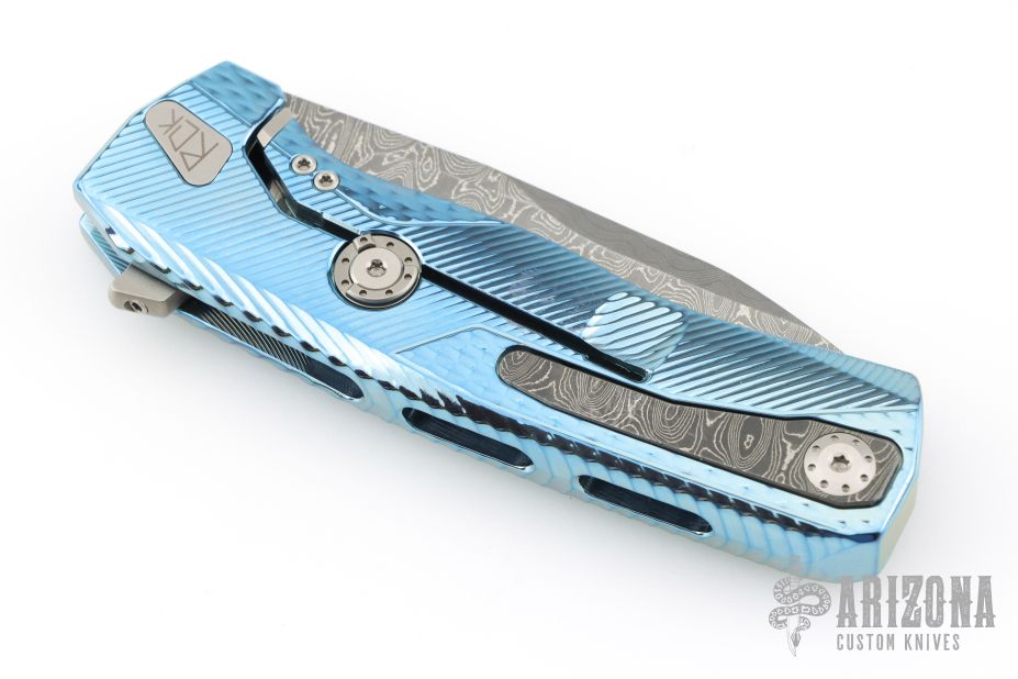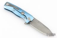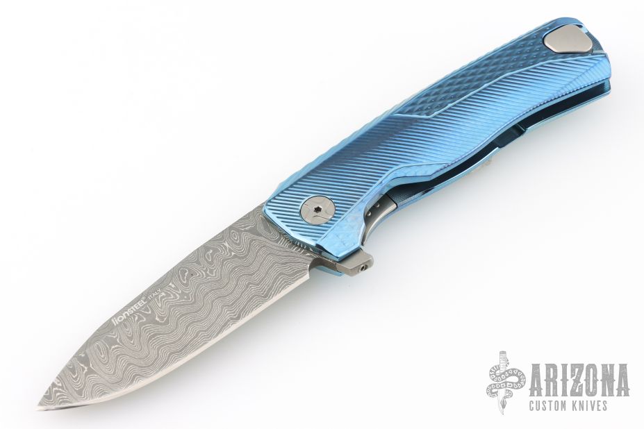 This model of the LionSteel ROK comes with a textured blue anodized titanium handle and a damascus blade with a damascus pocket clip.