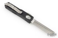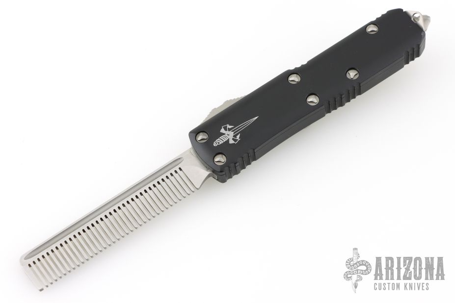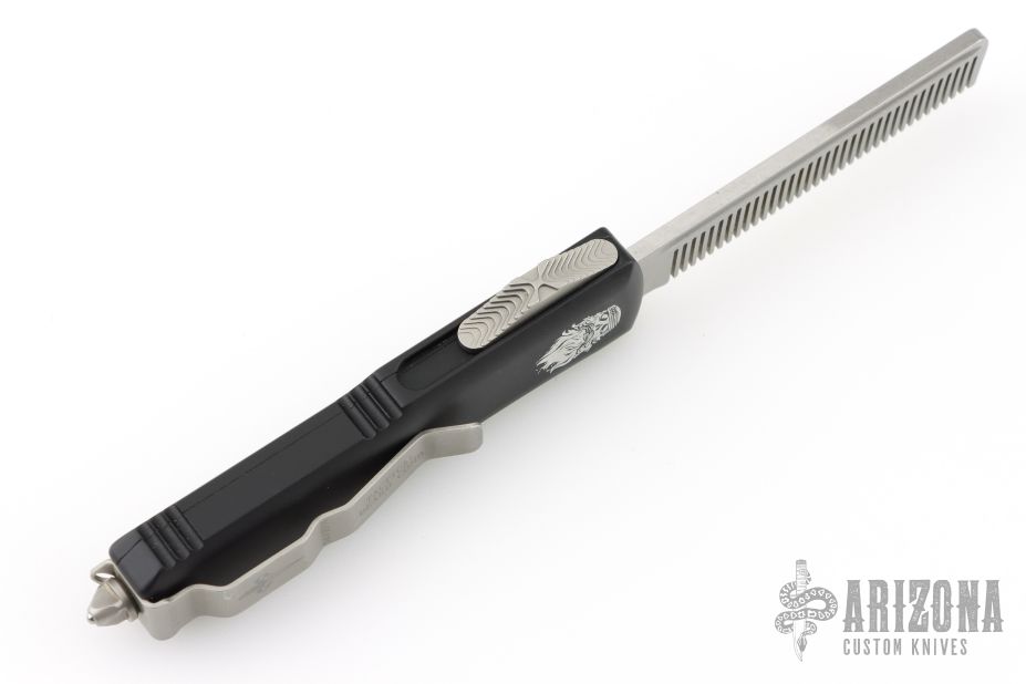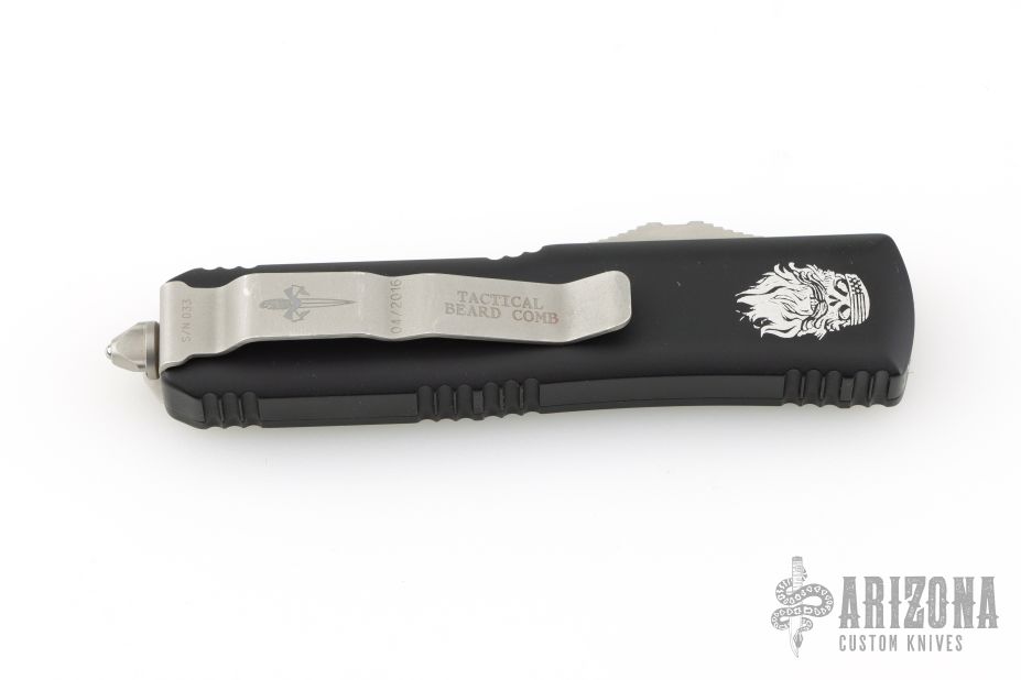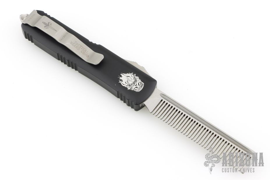 This UTX-85 OTF automatic Tactical Beard Comb by Marfione Custom Knives features a fine tooth hand ground stonewashed comb blade, and a black aluminum handle with tip down bead blasted stainless steel clip. Serial number 033 and dated 04/2016. Comes with original box, metal COA, and zipper case. Has scuffs and scratches, good condition otherwise.