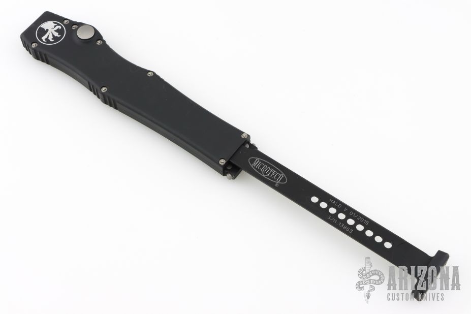 This Halo V OTF automatic has a satin finished tanto blade with a standard edge and a black aluminum frame, bead blast finished hardware, and black charging handle. Dated 01/2015 and S/N 13863. Comes in a Marfione Siphon II box and a Kydex sheath. Has some light scuffs and scratches great overall condition otherwise.