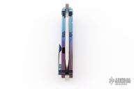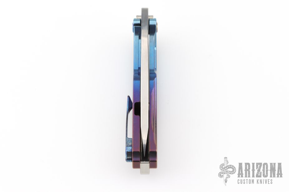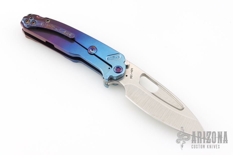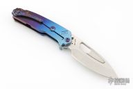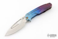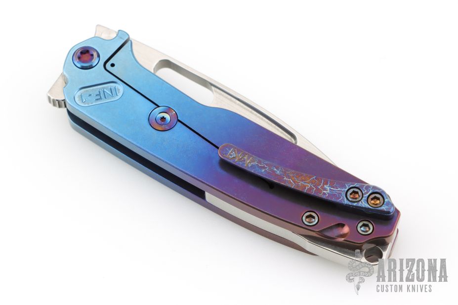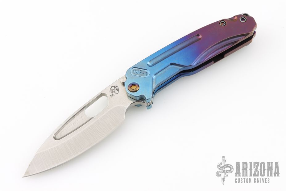 The all Titanium Infraction, by Medford Knife and Tool features a tumbled finished drop point blade with a recess and oversized thumb hole. The handle is composed of anodized titanium. The tip up carry pocket clip is composed of flamed titanium.  Nice detent, lockup and blade seating. Comes with original box, papers and a zipper case. Has a couple light scuffs, otherwise Excellent Condition.