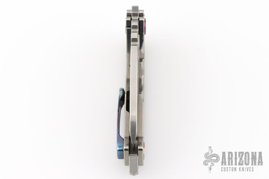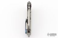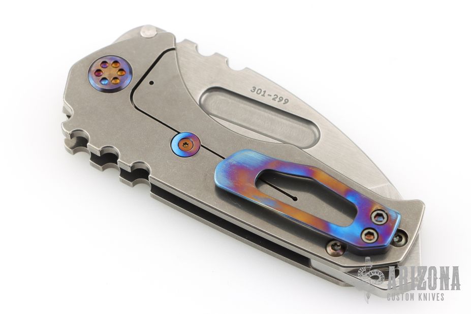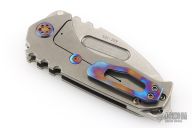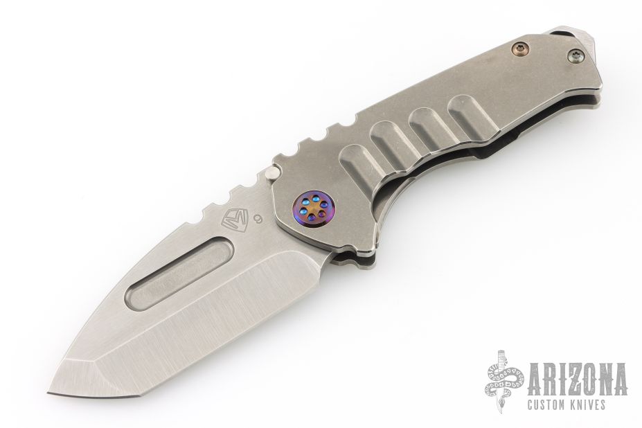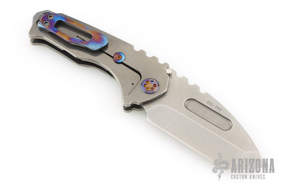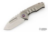 This Praetorian Genesis T from Medford Knife and Tool features a satin finished drop point, tanto style blade with fuller, notched thumb rest and dual thumb studs. The handle has a tumble finished titanium frame over a D2 backspacer/glass breaker. Flamed titanium tip up clip. Great blade seating, detent and lock up. Includes original box, papers and a zipper case. Excellent condition.