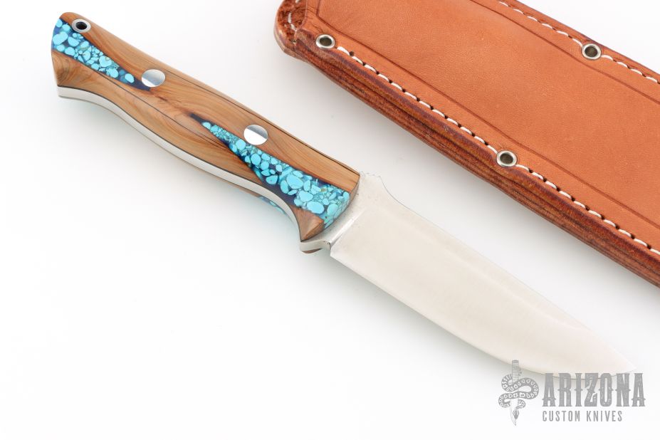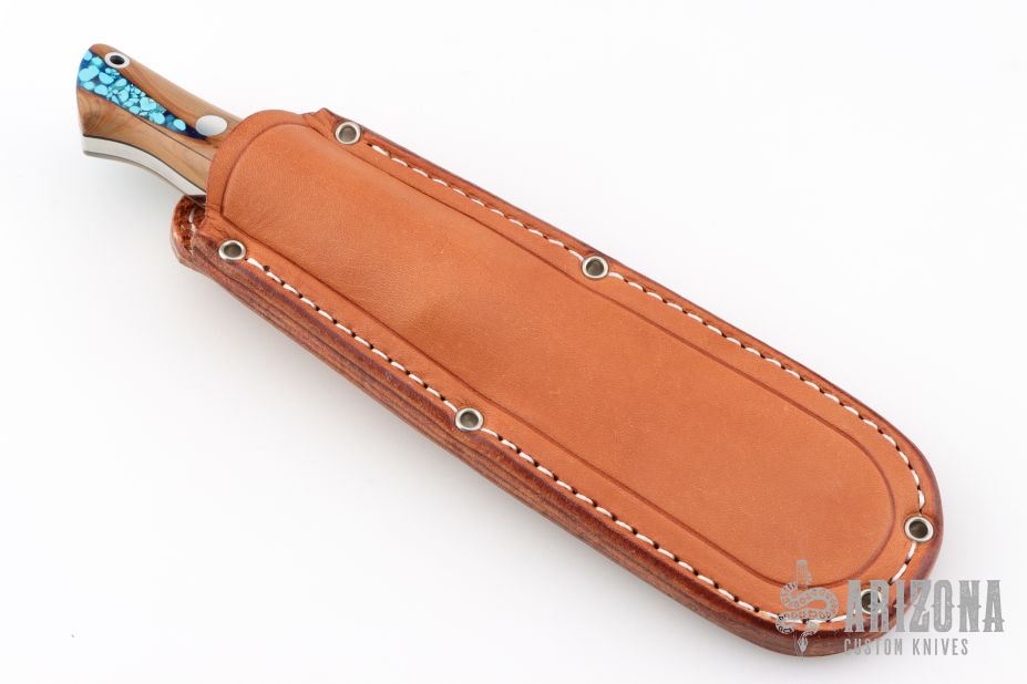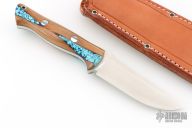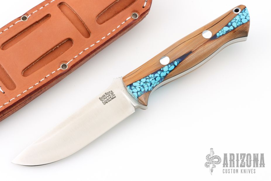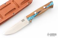 This Bravo-1 by Bark River Knives features a satin finished blade with .220" blade stock and 1.34" blade depth, full tang construction. The handle has wood and stone covers with aluminum pins. Comes with original box, papers, and leather sheath. Has a couple light scuffs, excellent condition otherwise.