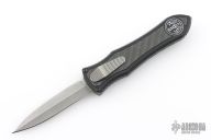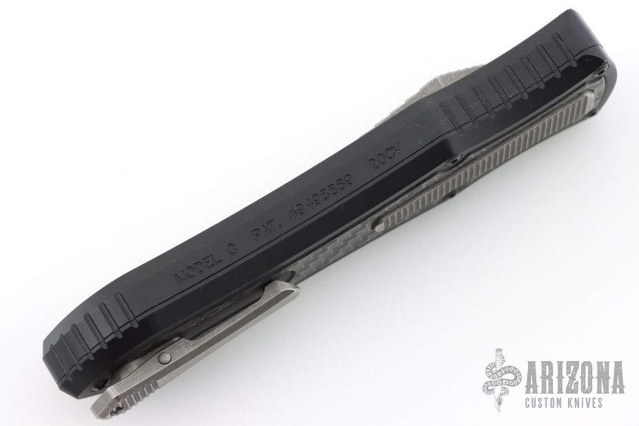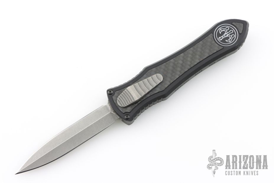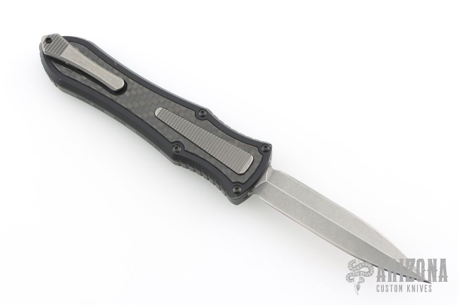 This knife is a Deadlock Model C by Grant and Gavin Hawk. It has a double-edged stonewashed blade. The handle has a carbon fiber and black aluminum frame with a tip down spring clip, titanium. The thumb slide on the handle is also titanium and handle has titanium overlays. Comes with a cloth pouch. Grant and Gavin Hawk set out to create a double action OTF with no blade play.... They did it, NO blade play. Has some minor wear on the corners of the frame, excellent condition otherwise.