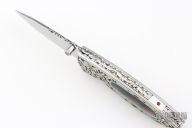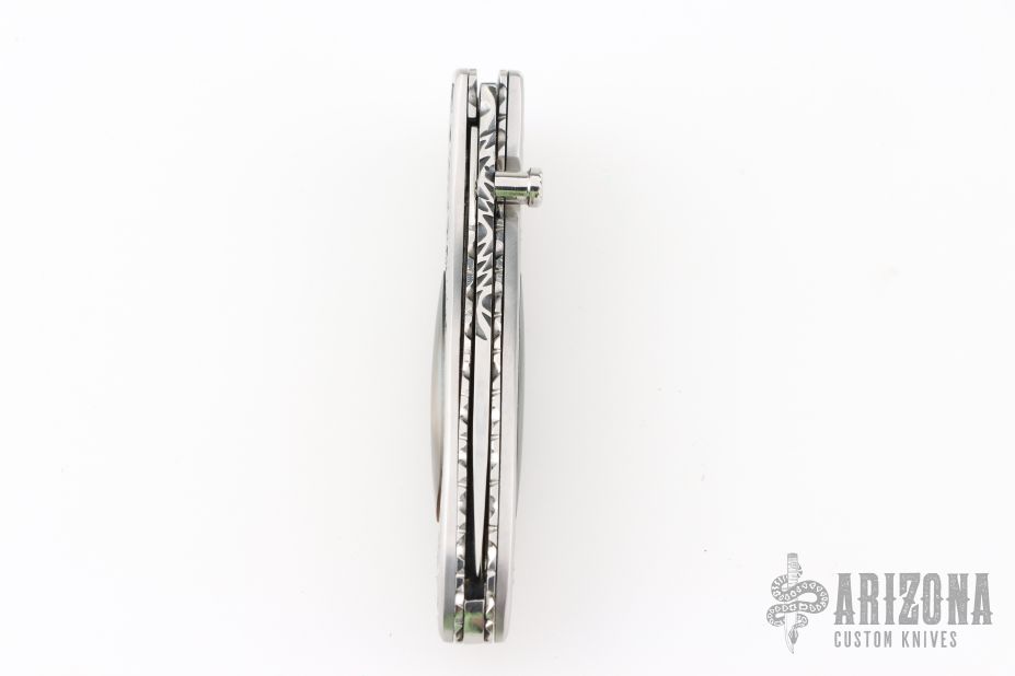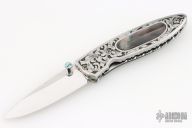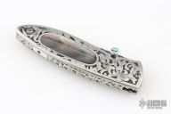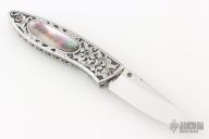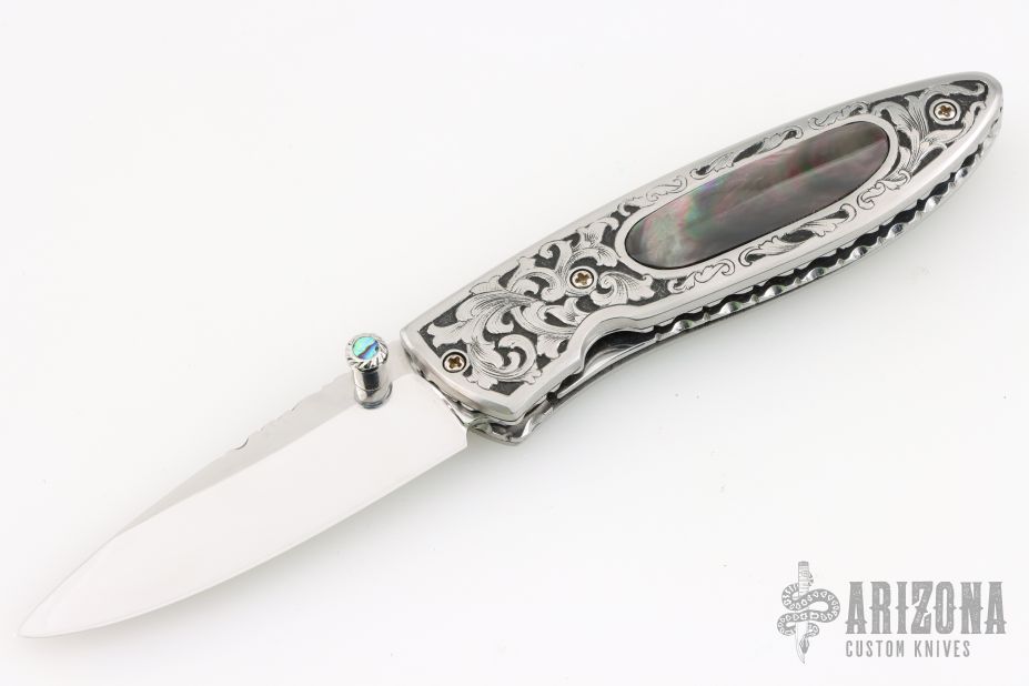 This Linerlock features a hand rub satin finished drop point blade with a single thumbstud with an abalone inlay. The handle has an engraved steel frame with black lip pearl inlays over file worked backspacer. Excellent condition