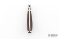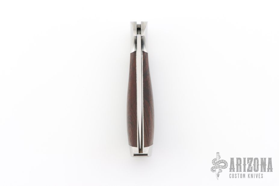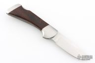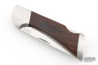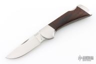 This lockback by Harley (please let us know if you know which Harley this is) features a hand rub satin finished blade with nail nick. The handle has dovetailed stainless steel bolsters, wood scales, stainless steel liners and backspacer. Nice lockup and blade seating. Has some light scratches, otherwise excellent condition. #4 on the blade and also a dot from the hardness testing. No idea what the hardness is, but it was important enough for him to test it and leave the mark visible.