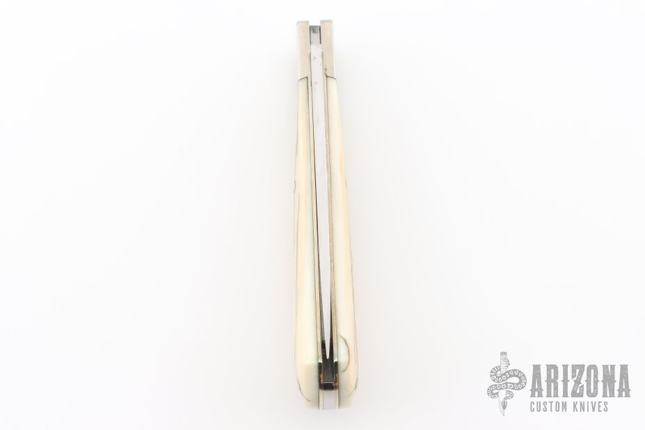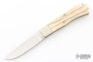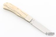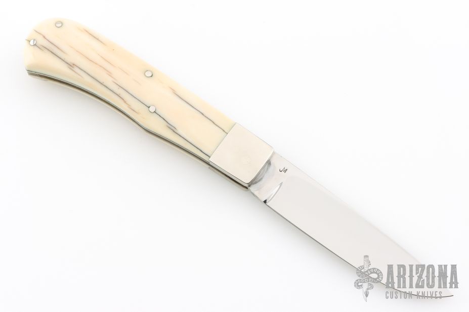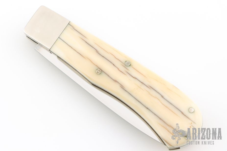 This slipjoint by Jeff Morgan features a mirror polished blade. The handle has nickel silver bolsters, giraffe bone scales, nickel silver liners and a stainless steel spring. Has half-stop, flush in all positions. Has a few light scratches, otherwise excellent condition.