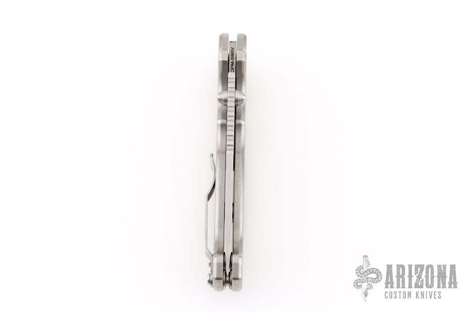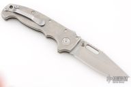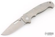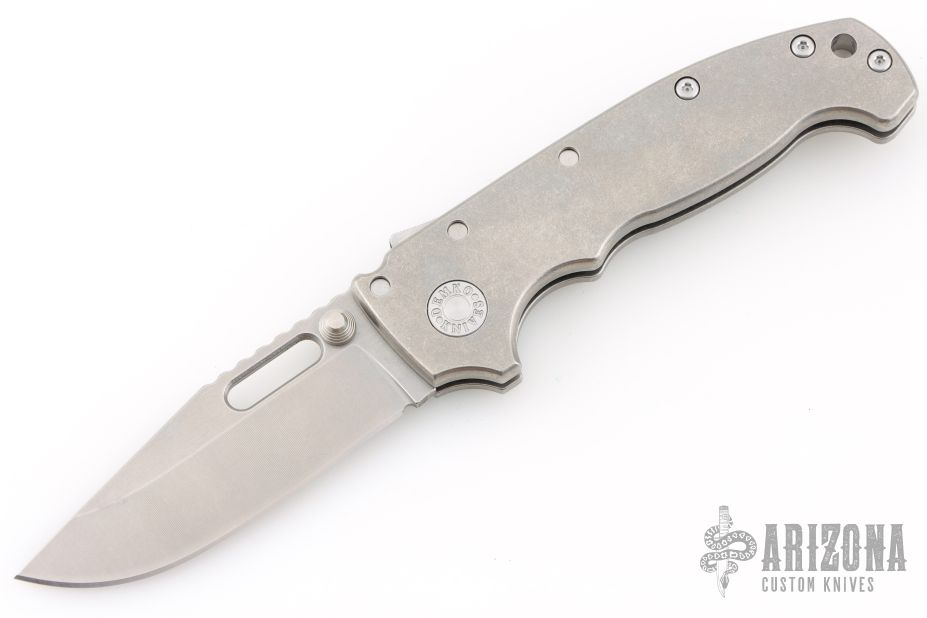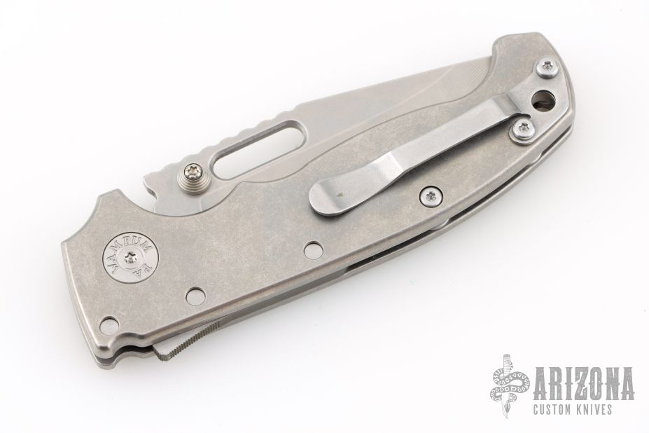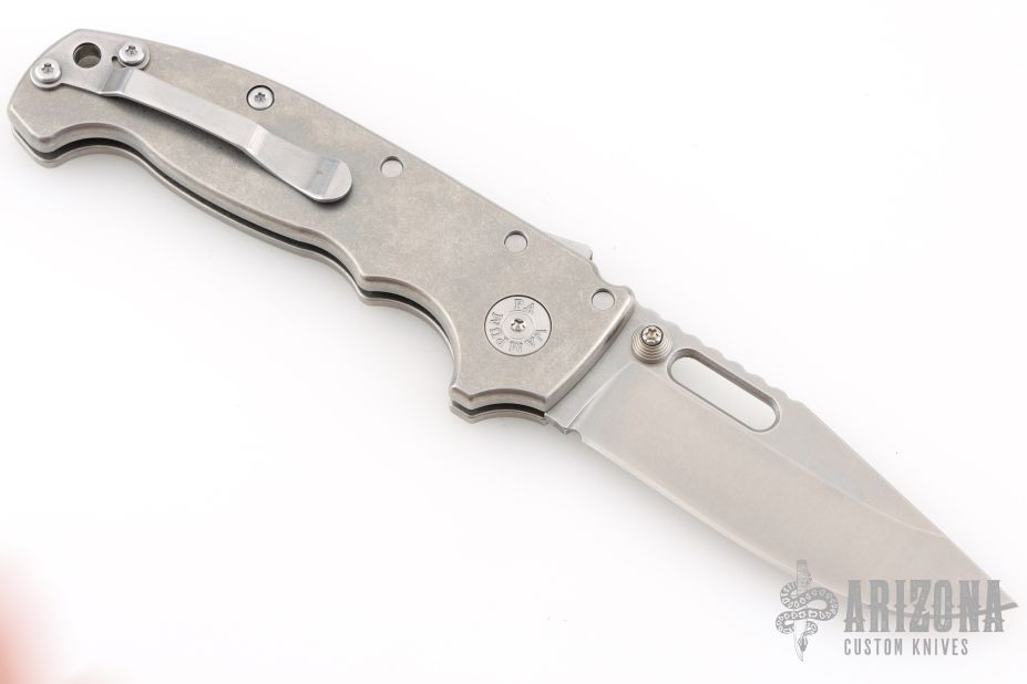 This AD20 by Demko Knives features a stonewashed blade with notched thumbrest, dual thumbstuds and a thumbhole. .130" blade thickness. The handle has a stonewashed titanium frame with a tip up stainless steel clip and "Shark" lock release on the spine. Comes with original box. Excellent condition.