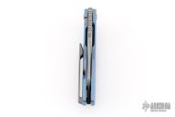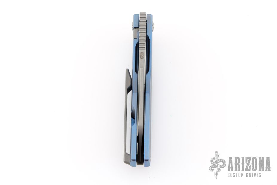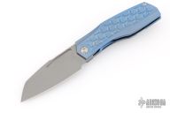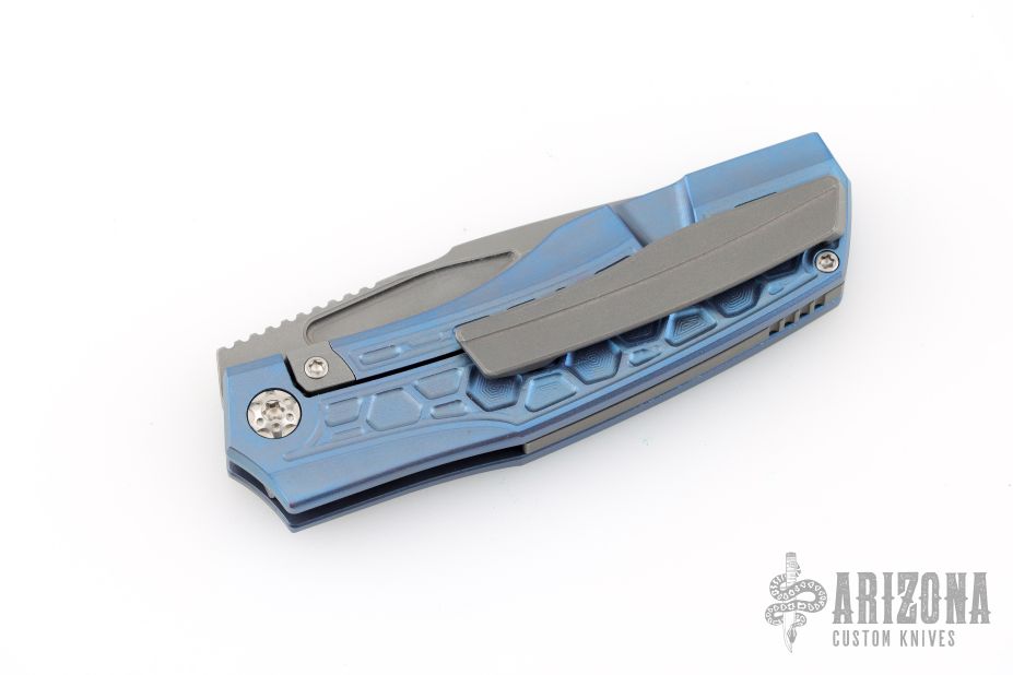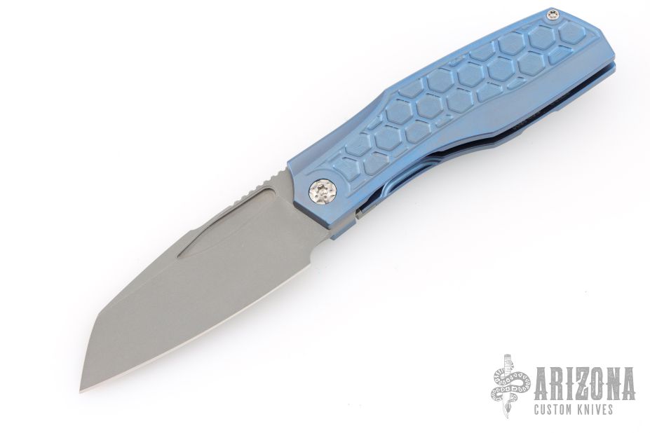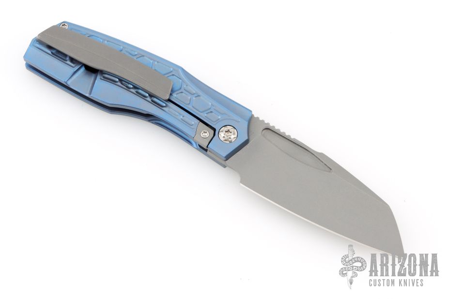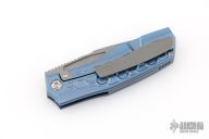 This Protean by Prince Customs is #468. It has a stonewashed blade with thumb groove and notched thumbrest. The handle has an anodized and honeycomb milled titanium frame with matching tip up clip and floating backspacer. Stainless lockface insert. Comes with original box and COA dated 6/2024. Excellent condition.