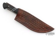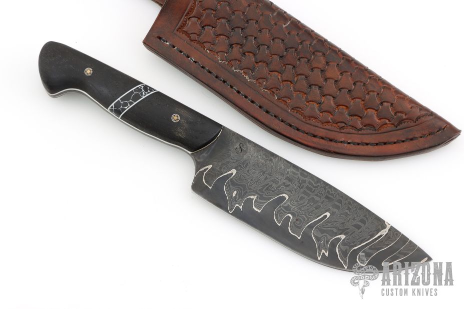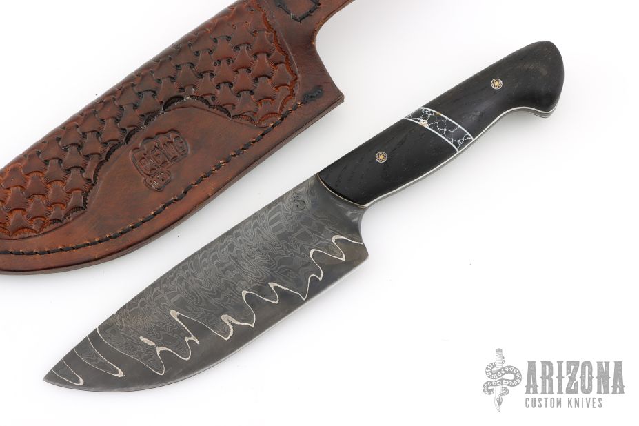 This Camp Knife by Solace Forge features a Bulldog San Mai Damascus blade with Twisted W's Damascus cladding, nickel shims and 80CRV2 core, .150" blade stock and 1.800" blade depth, full tang construction. The handle has bog oak scales with white liners and black/white truestone spacers, mosaic pins. Comes with a hand tooled brown leather sheath by PFNG Leather. New from maker. Comes with COA dated Oct 1, 2025.